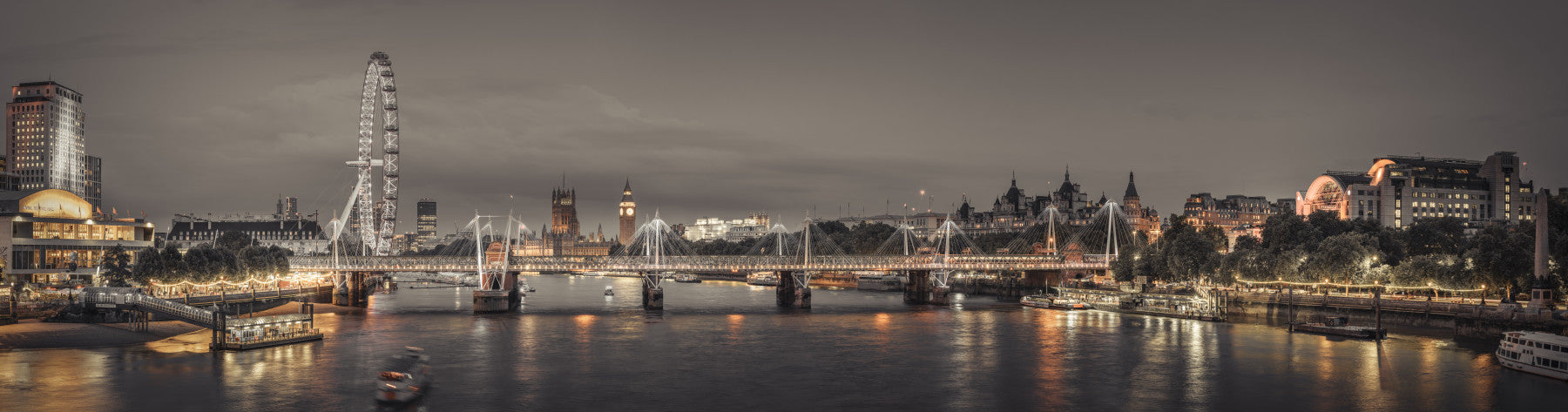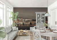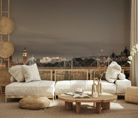 Evening view of the London city skyline with the River Thames. Capture the essence of London's charm with this stunning panoramic wallpaper for walls. The image features iconic landmarks bathed in twilight hues. The London Eye and Houses of Parliament stand proudly along the Thames. This design boasts a serene atmosphere and a touch of urban sophistication, making it ideal for a living room, home office, or entryway. The neutral tones easily complement a variety of interior styles, from modern minimalist to classic traditional.