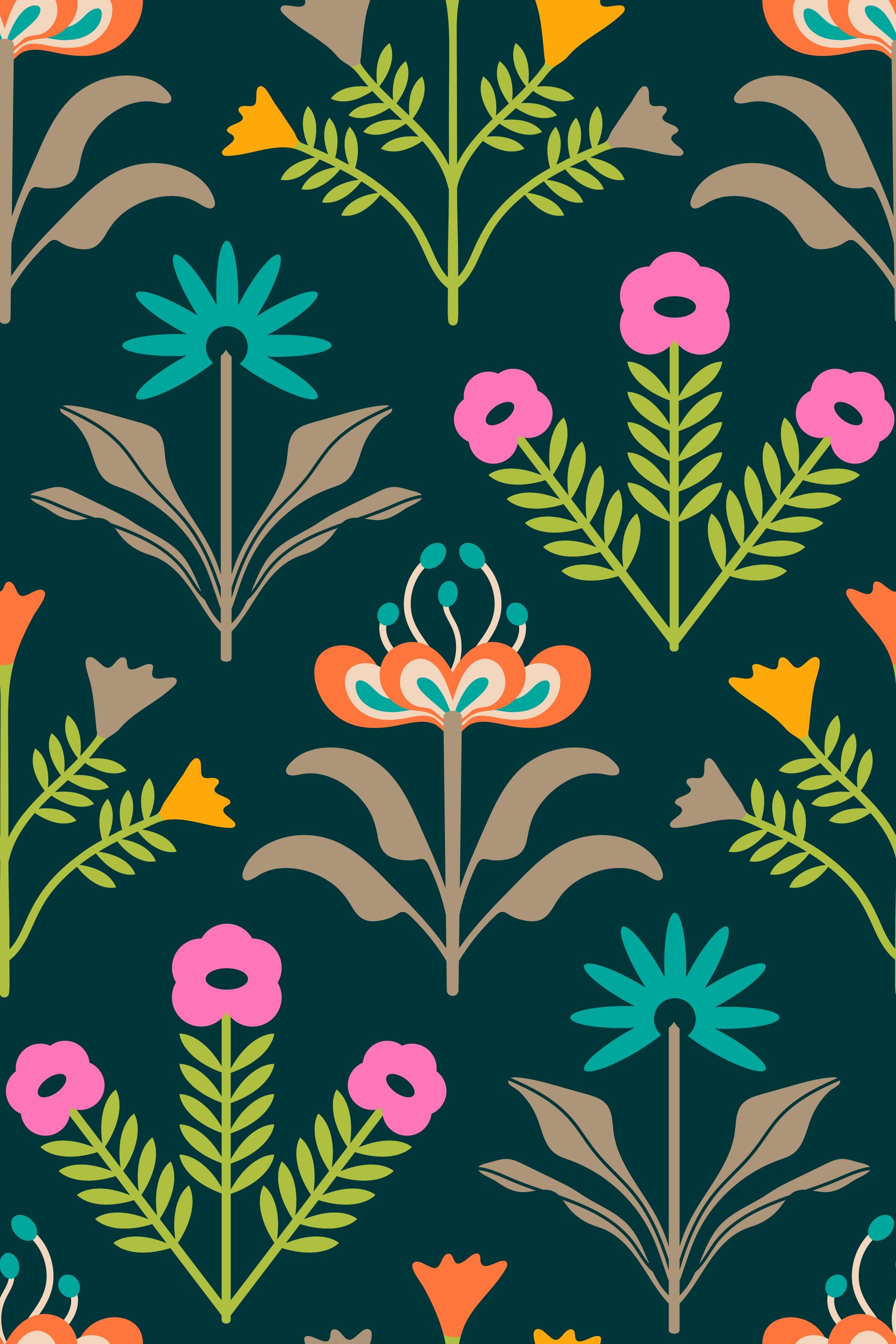 Step back in time with Lora a wallpaper that beautifully marries retro Mid-Century Modern style with a touch of Scandi simplicity and bright floral charm. This floral pattern features charming flowers vibrant rainbow colors and warm beige against a rich dark green background, creating a bright and inviting atmosphere. The minimalist yet eye-catching flowers evoke a sense of nostalgia and handcrafted beauty, perfect for bringing a touch of elegance to any space. Its clean lines and balanced composition embody Scandinavian aesthetics, while the retro floral motifs add a playful and vibrant touch. This pattern design is also available in Other Colourways too! Original wallpaper pattern design by Jackie Tahara of UnBlink Studio.