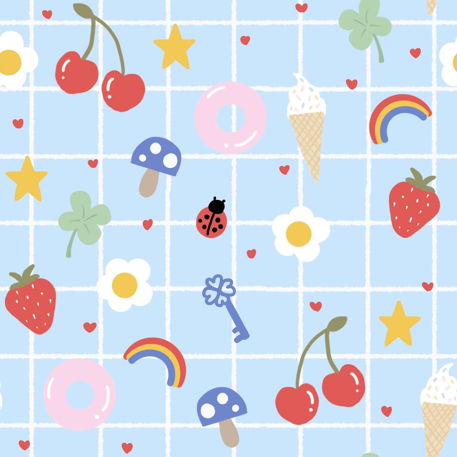 Sprinkle a little luck into your day with this charming 'Lucky Charm' wallpaper. Featuring a delightful assortment of good-fortune symbols against a soft blue checkered background, this playful design is sure to bring a smile to your face. Discover four-leaf clovers promising luck, bright stars radiating positivity, and sweet treats like cherries, strawberries, donuts and ice cream to sweeten your mood. Tiny hearts flutter between friendly mushrooms and even a ladybug finds its place here, all contributing to a whimsical and comforting aesthetic. A blue key with hearts on it, suggests unlocking happiness and future success. Let this cheerful wallpaper be a constant reminder of the joy and optimism that life has to offer, transforming your screen into a vibrant haven of happiness and good vibes.