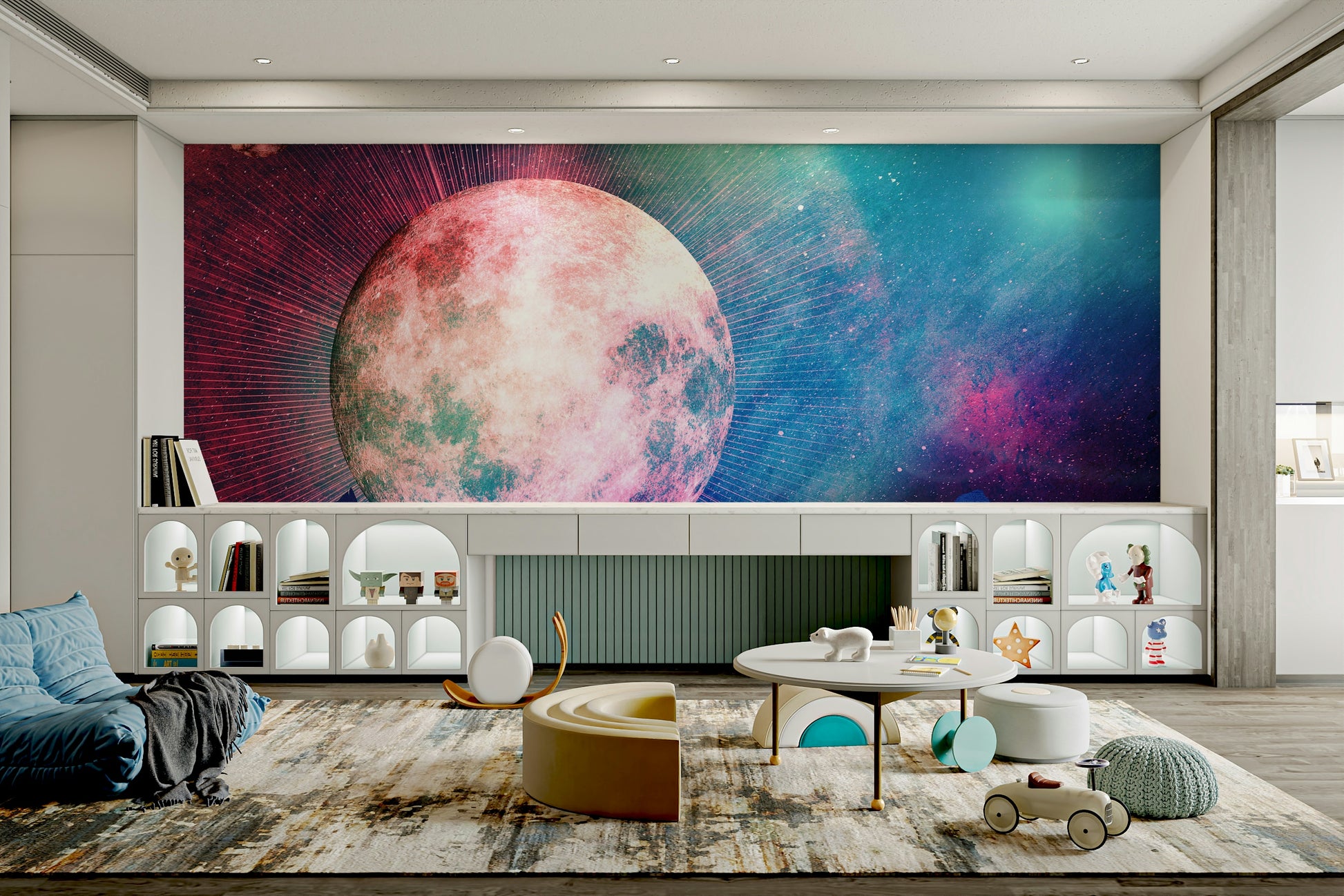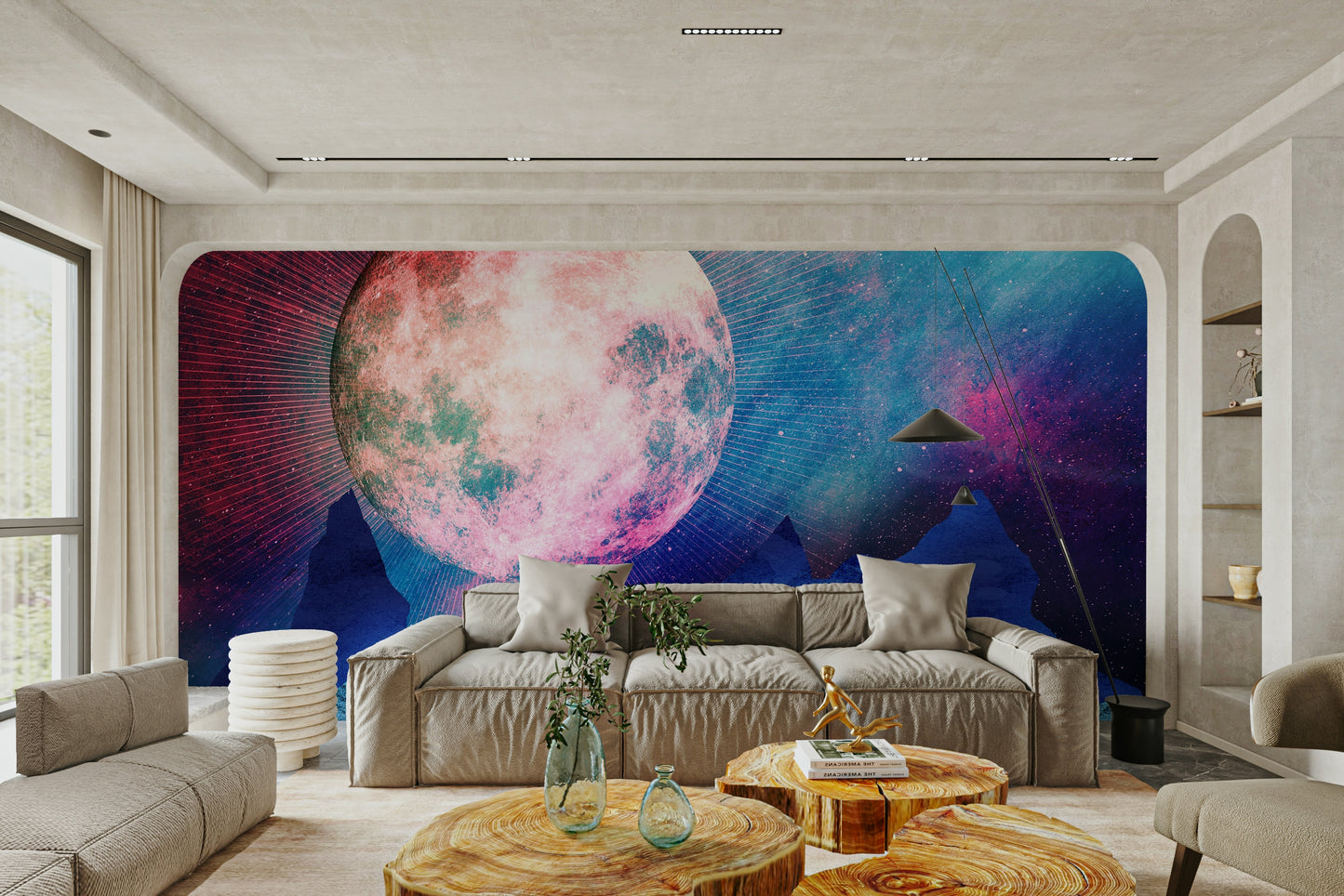 Witness the spectacle of a lunar eclipse as it casts its otherworldly glow upon a majestic range of blue mountains. 'Lunar Eclipse' captures the breathtaking moment in a vibrant, textured composition. A large, pink-hued moon dominates the scene, its light illuminating the peaks below with an ethereal radiance. The dark blue mountains are rendered with a unique textural effect, giving them a sense of depth and weight against the cosmic backdrop of a star-dusted night sky. The color palette evokes a sense of tranquility and mystery, while the dramatic lighting creates a truly captivating visual experience. This wallpaper is ideal for those who appreciate both the natural beauty of mountains and the mysterious allure of space.
