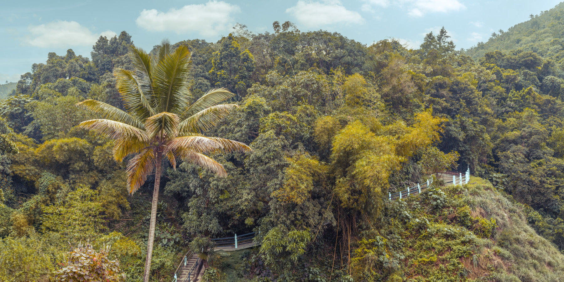 The Lush Green Mountain Wall Mural gives your home a feeling of natural peace and quiet beauty. This mural wallpaper shows a beautiful view of a lush green forest covering a hillside. A peaceful path winds through the trees, while a single palm tree stands out in the foreground. The serene atmosphere is a simple way to get a unique and relaxing feel for any room. This high-quality wallpaper for walls is ideal for a living room, bedroom, or home office.