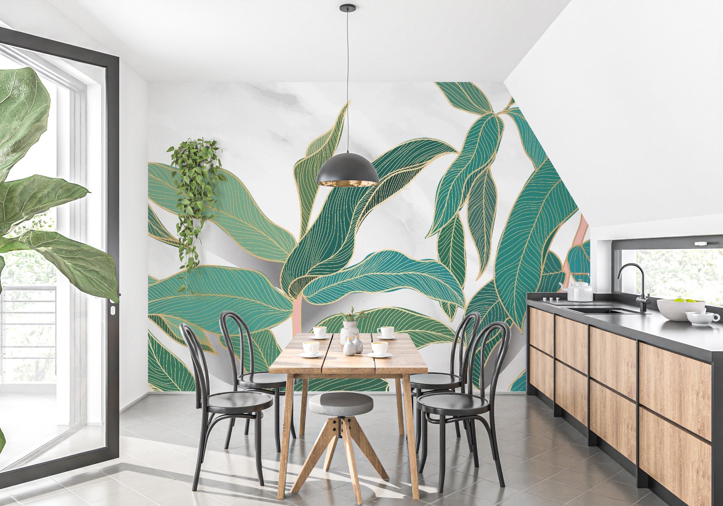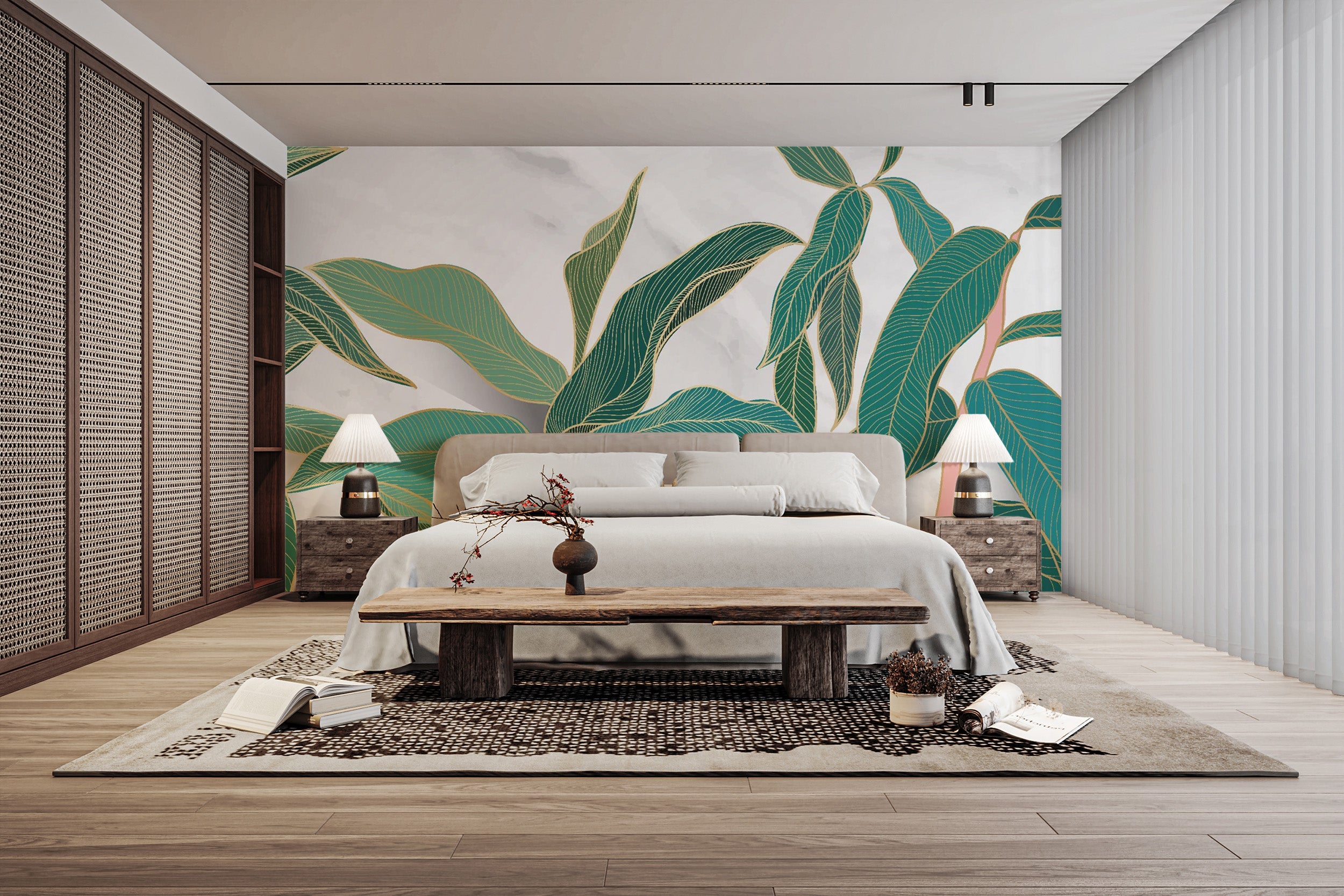 Bring a slice of the tropics into your home with these gold-edged tropical leaf wallpaper murals. Its dual-toned green leaves create a vibrant contrast, perfect for transforming your living room or patio into a style haven. This mural isn't just a decorative piece; it's a statement of luxury and refined taste. Impress your guests with your discerning eye for interior design.