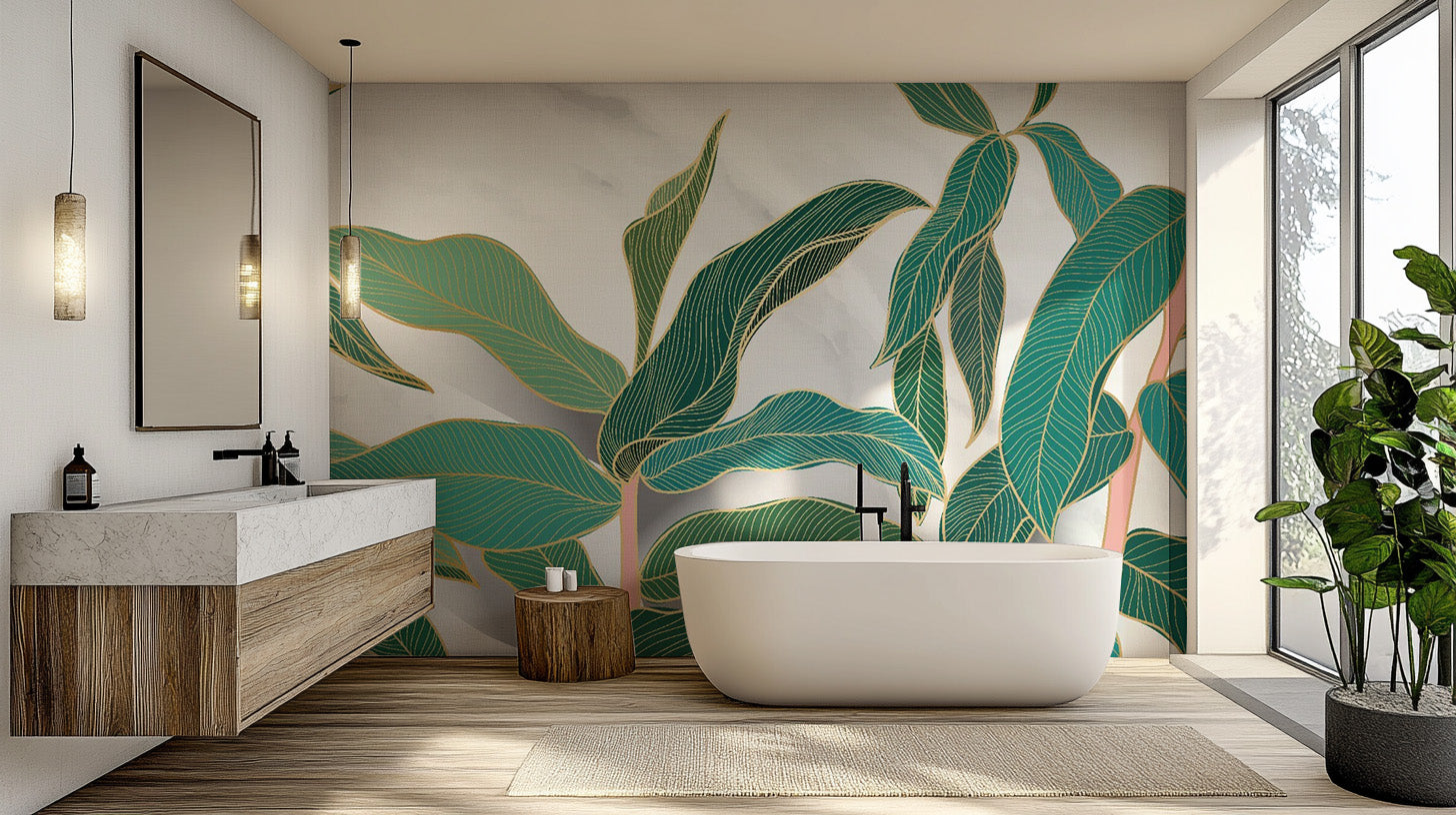 Complete your decor by pairing this tropical peel-and-stick wallpaper mural with metallic accents. Combining gold-veined leaves and metallic furnishings creates a harmonious and upscale ambiance. Your living space will not just be a place to live but a showcase of elegance and modern style. Make a bold statement with this enchanting tropical wallpaper mural and enjoy a living space that is both inviting and luxurious.