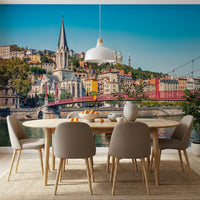 Transform any room with this stunning view of Lyon. The red footbridge over the Saône River offers a captivating focal point, framed by historic buildings. The clear blue sky brings openness, while the church spires and hillside structures add depth. Install this wallpaper for walls in a living room, dining area, or hallway to create a sense of European charm. The balanced composition and vivid colors will complement both modern and classic interiors, adding a touch of wanderlust to your space.