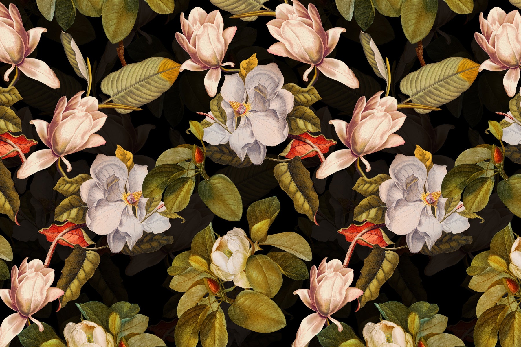 Transform your room with this botanical wallpaper by Uta Naumann. It features a collection of magnolia flowers and leafy foliage against a dark backdrop. The detailed illustration brings nature's beauty indoors. This wallpaper for walls adds depth and a touch of class to your dining room or living room. The design complements interiors with a rich color palette and a refined botanical aesthetic.