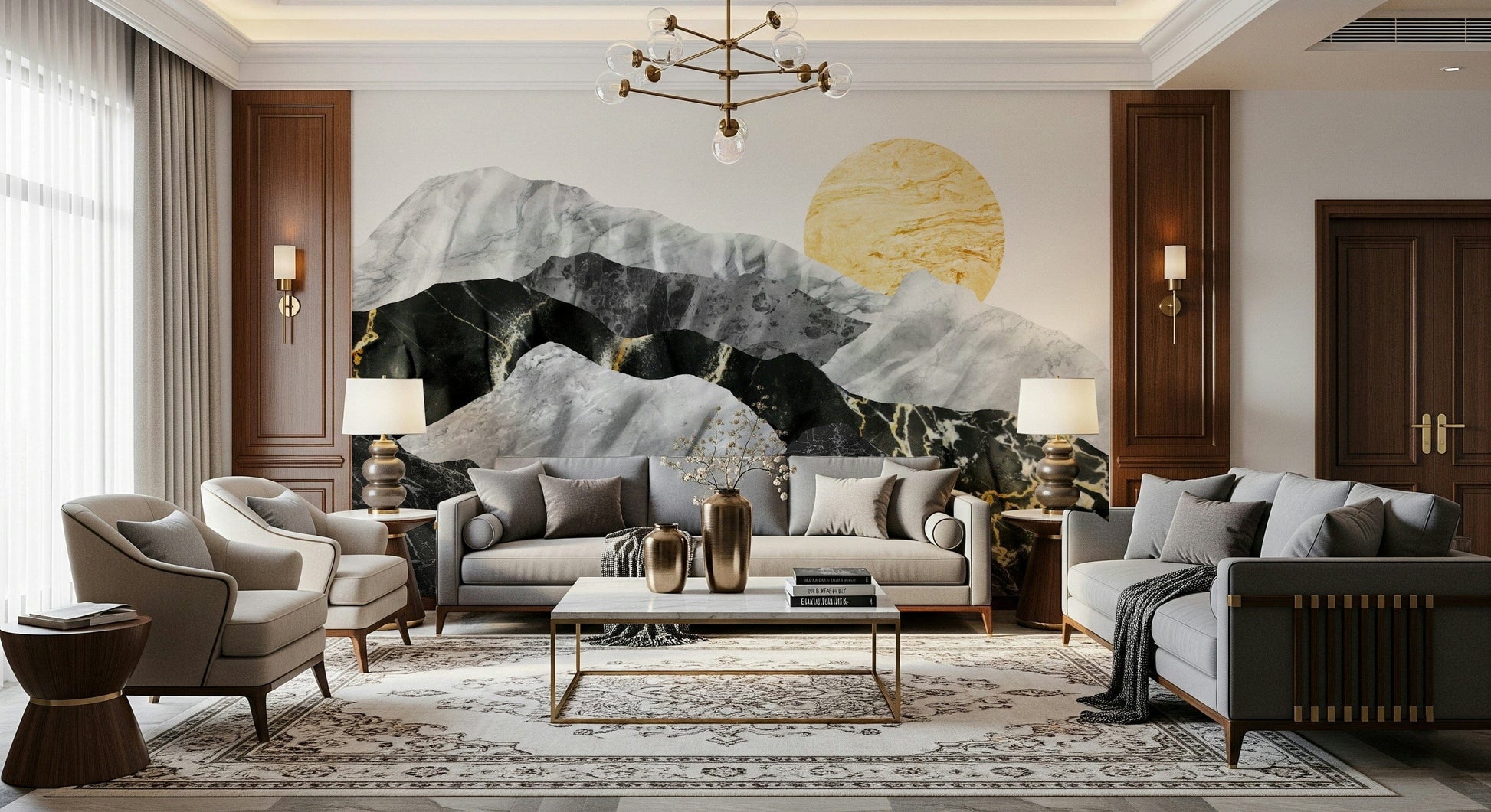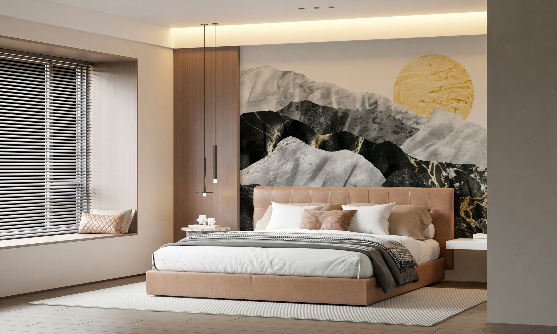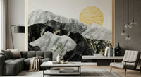 This geometric mountain design brings a modern edge to your living space. The marble textures and warm sun detail add depth. The elegant black, white, and gold tones complement contemporary and minimalist interiors. It makes stylish wallpaper for walls in the living room, bedroom, or home office. The landscape creates a peaceful atmosphere.