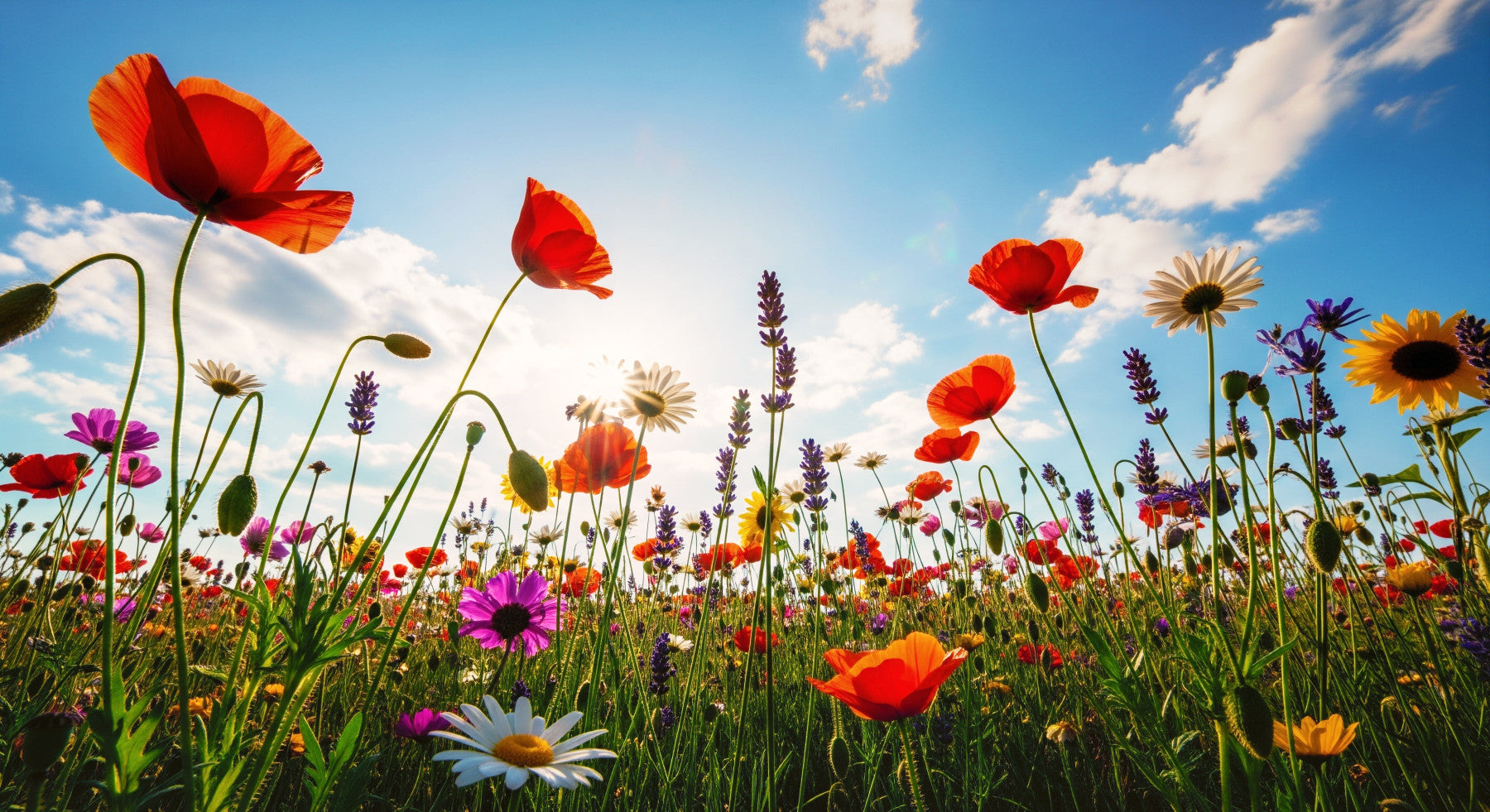 Invite nature inside with this beautiful floral display. Colorful wildflowers stand tall beneath a bright blue sky, creating a vibrant and cheerful scene. Consider wallpaper for walls to transform a space into an idyllic escape. Perfect for brightening a dining room or study, the lively botanical motif works well with natural light and neutral decor. The design fills spaces with warmth, offering both energy and a touch of the countryside.