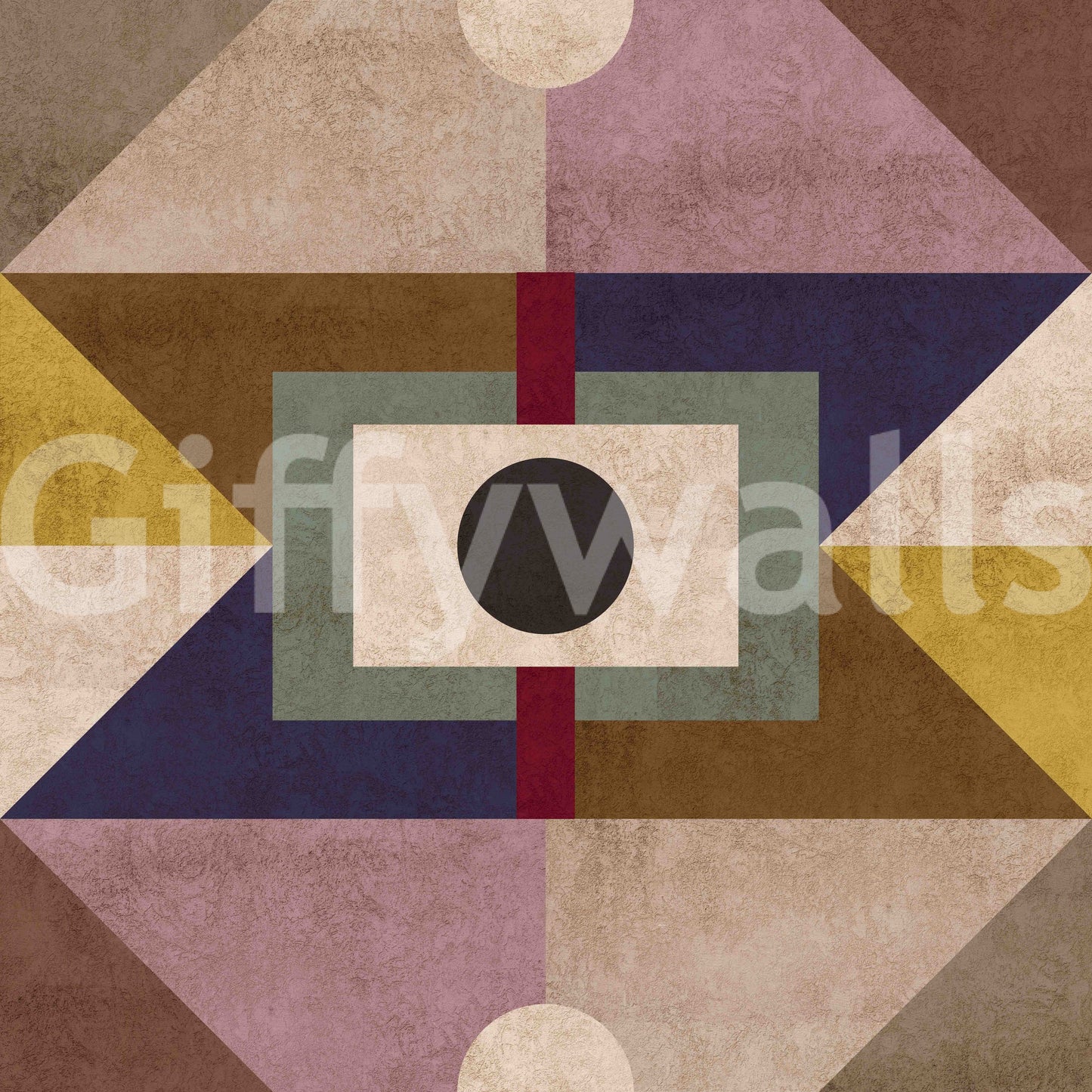 Evoking the warmth and sophistication of mid-century modern design, this wallpaper presents a geometric composition dominated by earthy brown tones and subtle textures. Interlocking shapes in hues of beige, mustard yellow, and muted blues create a sense of depth and visual interest. The design features bold geometric shapes and clean lines quintessential to the era, accented by a central element, a black dot that serves as a focal point. The warm color palette lends a comforting and stylish ambiance, perfect for adding a touch of retro charm to any space, offering a balance between organic textures and structured design.