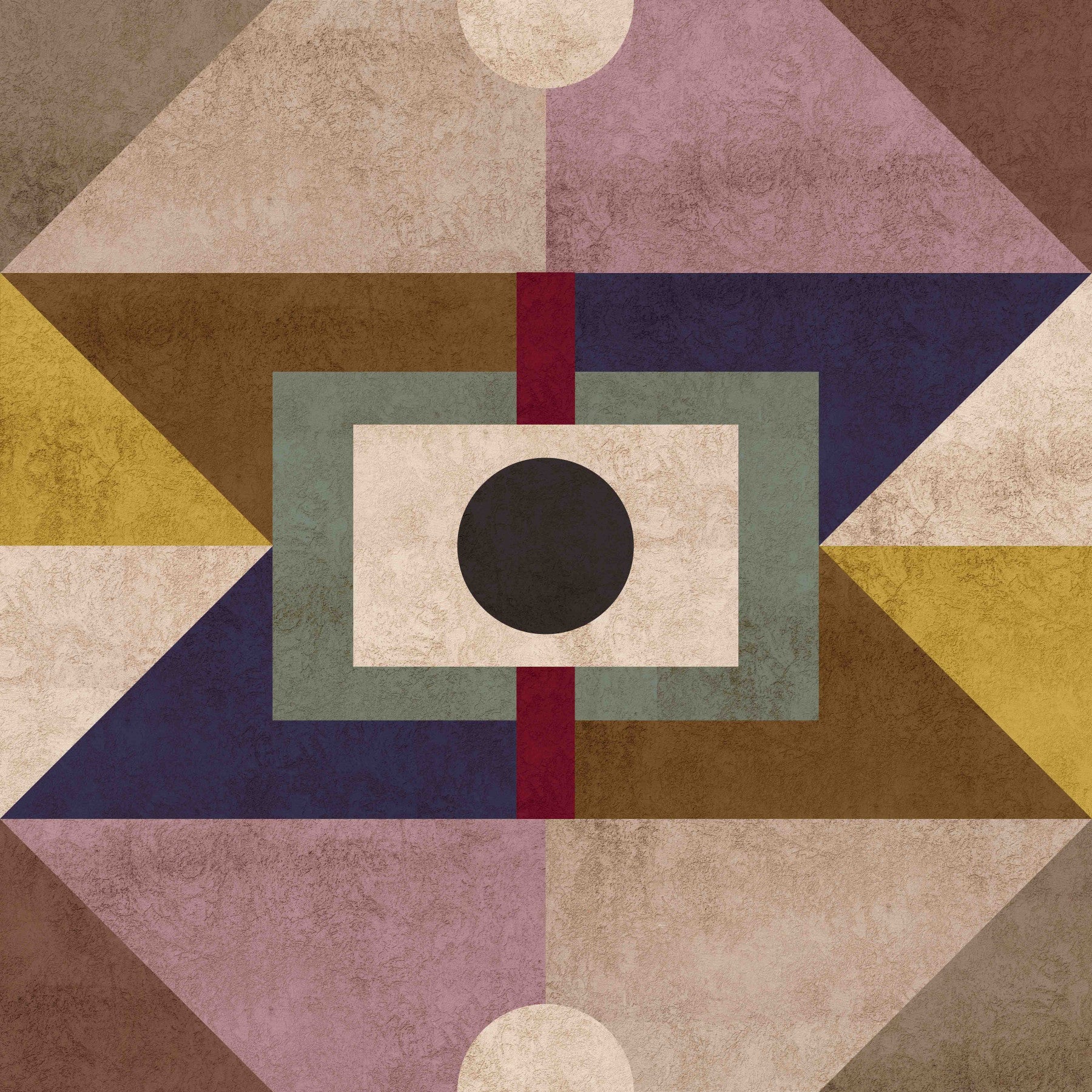 Evoking the warmth and sophistication of mid-century modern design, this wallpaper presents a geometric composition dominated by earthy brown tones and subtle textures. Interlocking shapes in hues of beige, mustard yellow, and muted blues create a sense of depth and visual interest. The design features bold geometric shapes and clean lines quintessential to the era, accented by a central element, a black dot that serves as a focal point. The warm color palette lends a comforting and stylish ambiance, perfect for adding a touch of retro charm to any space, offering a balance between organic textures and structured design.