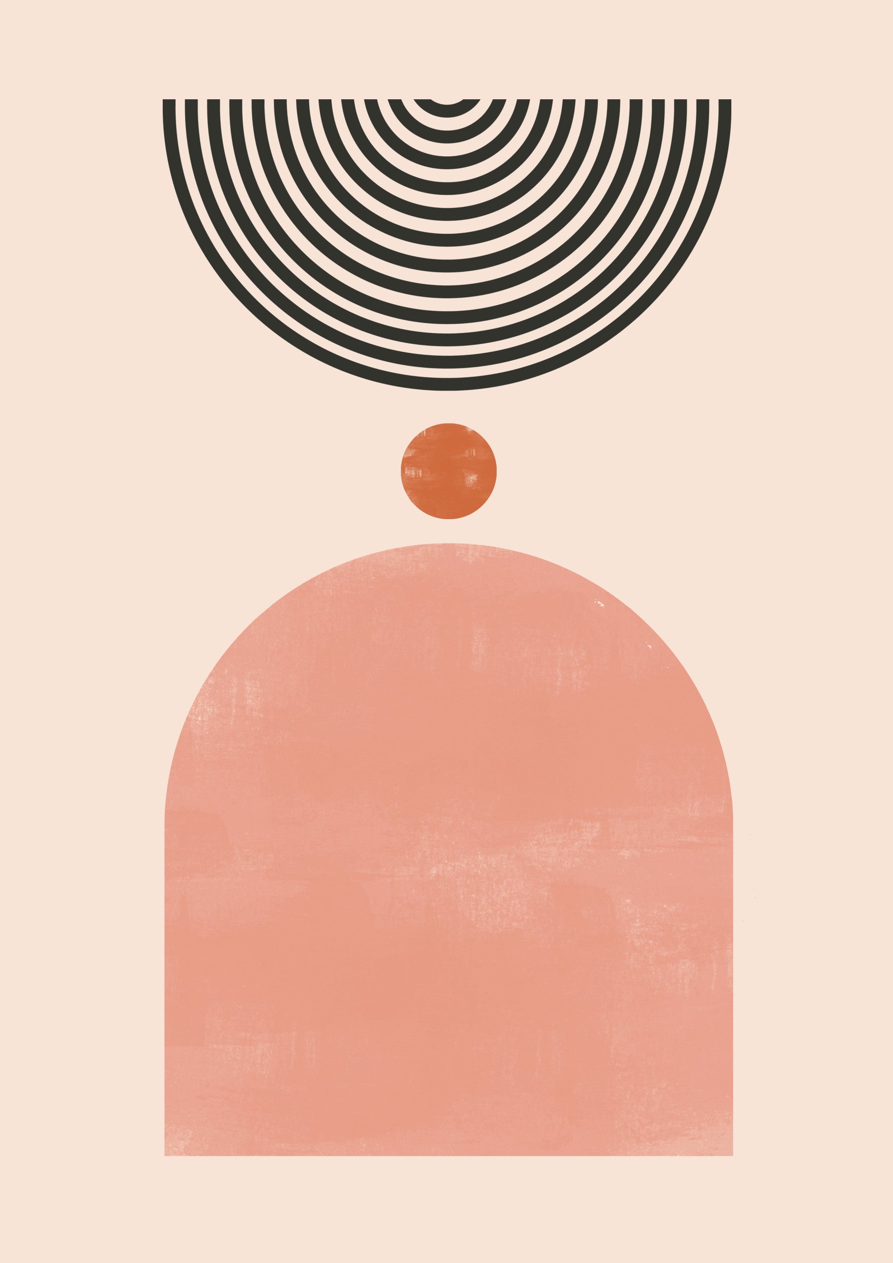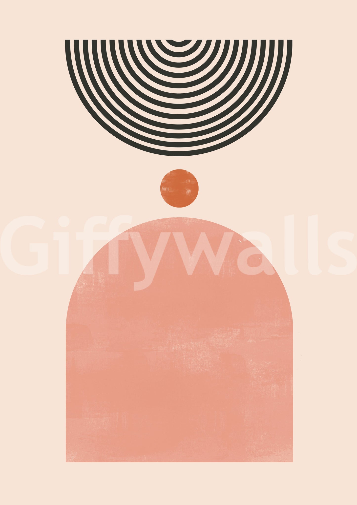 Inspired by mid-century modern design, this wallpaper presents a balanced composition of abstract shapes. The interplay of a bold, striped semi-circle and muted, organic forms in peach and terracotta creates a visually captivating yet serene effect. This wallpaper is perfect for adding a touch of retro-chic to contemporary interiors. The color palette is both warm and inviting, offering a sense of calm and sophistication. Its understated elegance makes it ideal for various spaces, seamlessly integrating into bedrooms, living areas, or even home offices seeking a touch of mid-century style and warmth.