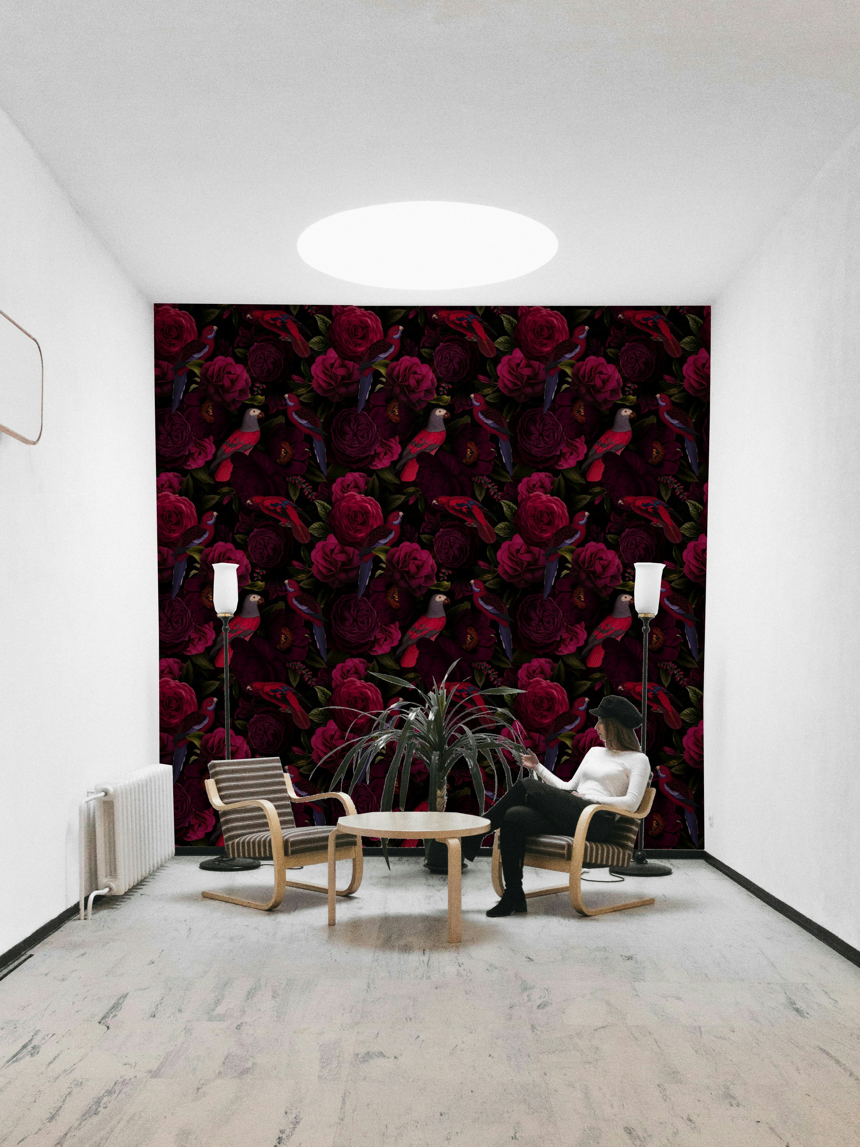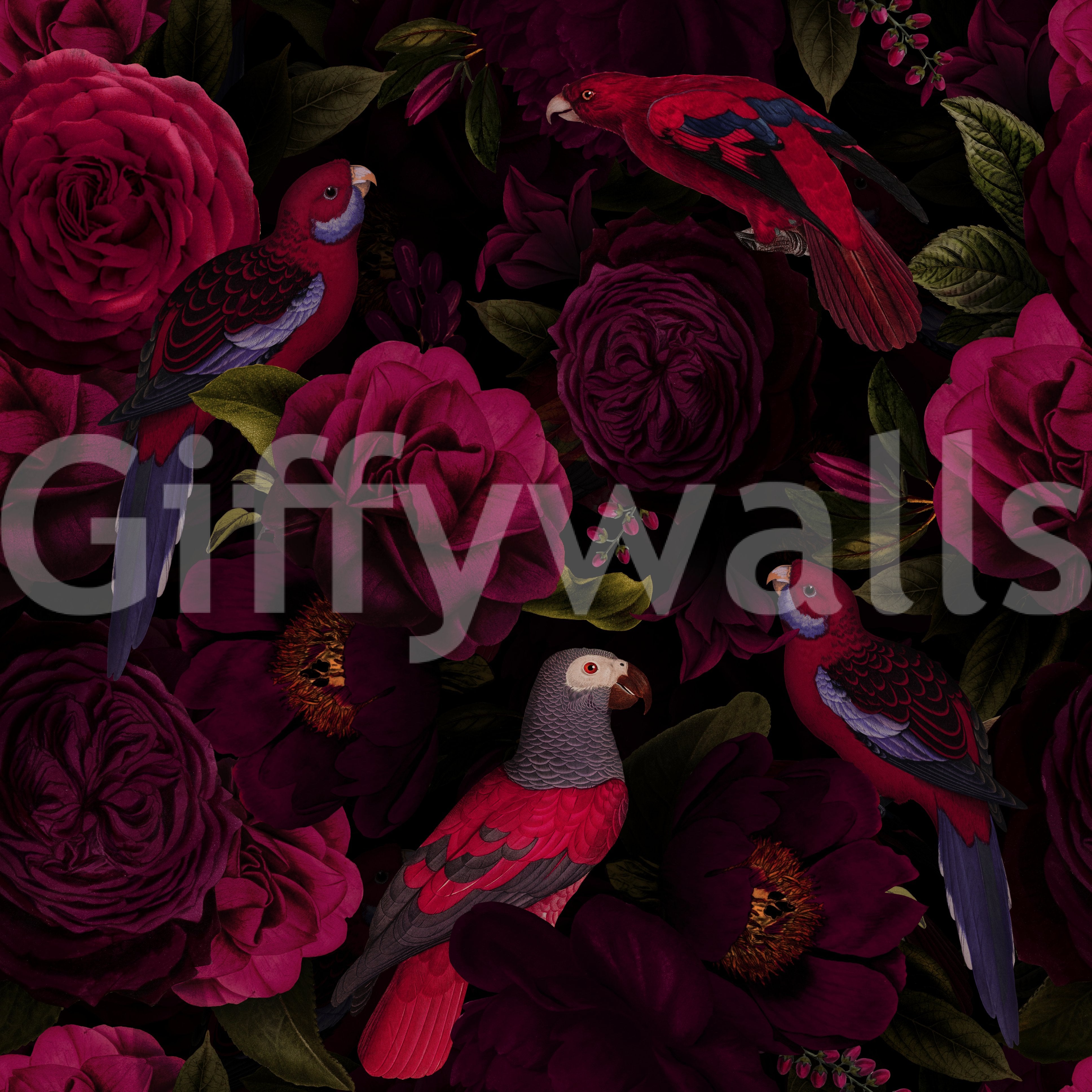 Unfold the captivating allure of 'Midnight Bloom,' a wallpaper design where deep crimson roses and vibrant parrots dance in harmonious darkness. The rich, saturated colors evoke a sense of mystery and romance, creating a breathtaking visual tapestry. Detailed botanical illustrations of roses and peonies are skillfully blended with the lifelike depictions of parrots, producing a unique blend of nature's elegance and vibrant wildlife. The design's seamless pattern allows for a luxurious and immersive experience, turning any room into a secret garden bathed in the shadows of night.