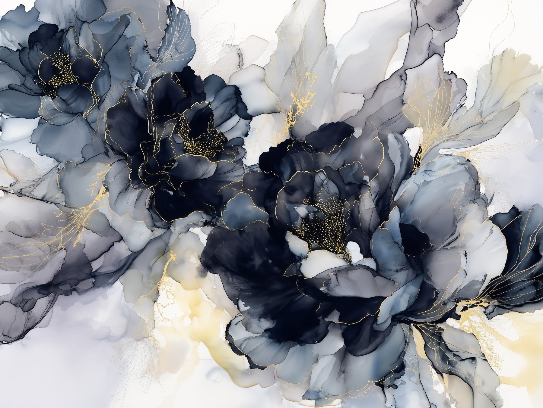 Embrace the allure of the night with Midnight Blossom Ink Flowers a captivating wallpaper that blends the elegance of floral artistry with the mystique of twilight. This design showcases opulent blossoms rendered in flowing inks of deep indigo and soft, ethereal grays, creating a mesmerizing dance of light and shadow. Delicate gold accents trace the edges of each petal, adding a touch of luxury and illuminating the composition with a subtle, captivating shimmer. Evoking a sense of tranquility and sophistication, "Midnight Blossom Ink Flowers" transforms any screen into a gallery of refined beauty. Perfect for adding a touch of modern artistry to your digital space, this wallpaper is a visual poem that whispers of quiet evenings and blooming wonders, infusing your screen with a touch of dramatic elegance and refined charm.