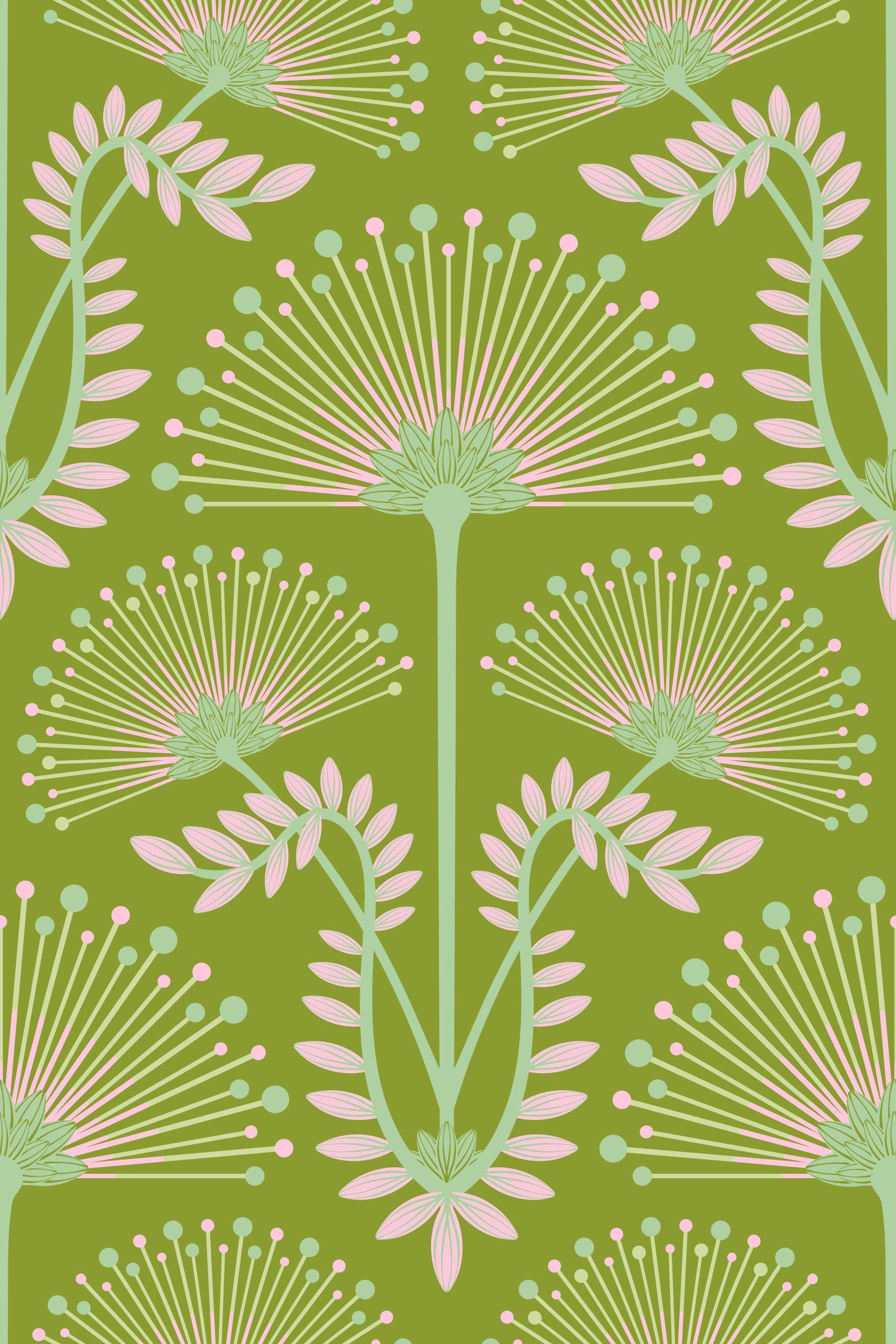 Evoke the elegance of the Roaring Twenties and the Jazz Age with this Mimosa floral wallpaper. This Art Deco-inspired design features a striking botanical damask pattern, blending symmetrical flower motifs with geometric precision in a palette of soft pink, green and chartreuse on a spring green background. Graceful mimosa blooms with radiating details and organic curving foliage bring a touch of nature and a visual rhythm to this pattern. A sophisticated and timeless choice, "Mimosa" adds a touch of vintage glamour to any space while remaining contemporary and elegantly stylish. This pattern design is also available in Other Colourways too! Original wallpaper pattern design by Jackie Tahara of UnBlink Studio.