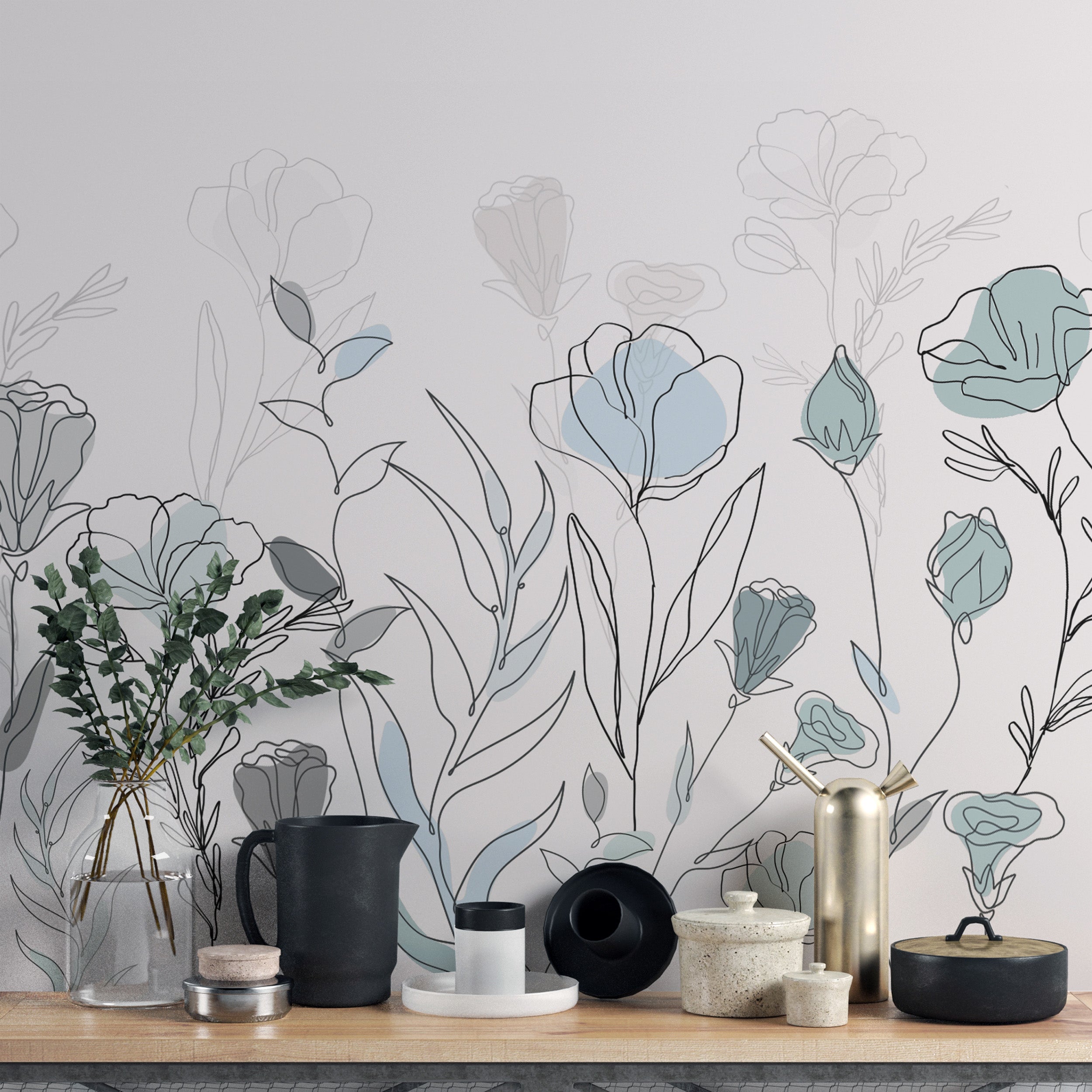 Bring a modern touch to any room with minimalist floral line art wallpaper. This design creates a serene atmosphere, featuring delicate hand-drawn flower wallpaper in soft pastel tones. The subtle abstract botanical wallpaper blends effortlessly with contemporary and classic interiors. Muted shades of blue and gray add a timeless appeal, making it a perfect choice for bedrooms, living areas, or workspaces. The modern floral wallpaper complements various color palettes while adding visual interest. Enhance walls with the beauty of elegant botanical murals for a refined and sophisticated look. This pastel flower wallpaper offers a seamless way to refresh interiors.