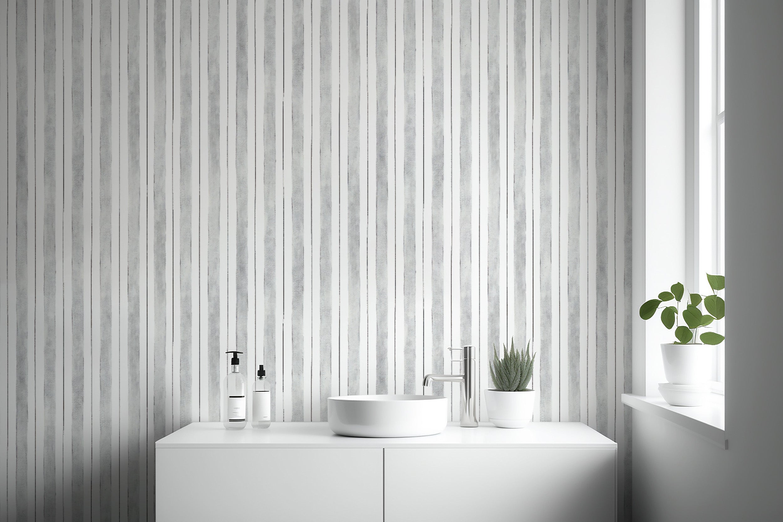 Bring a sleek touch to any room with this minimalist grey striped wallpaper. The clean vertical stripes in soft grey and white create a refined, modern look that is perfect for living rooms, bedrooms, or offices. This striped wallpaper adds a subtle pattern that complements contemporary and classic interiors. The neutral tones blend seamlessly with various color schemes, making it a versatile choice for modern wall coverings. Ideal for creating a sense of height and space, this grey and white wallpaper gives walls a polished finish while maintaining a light, airy feel. Refresh your walls with this simple, timeless design.
