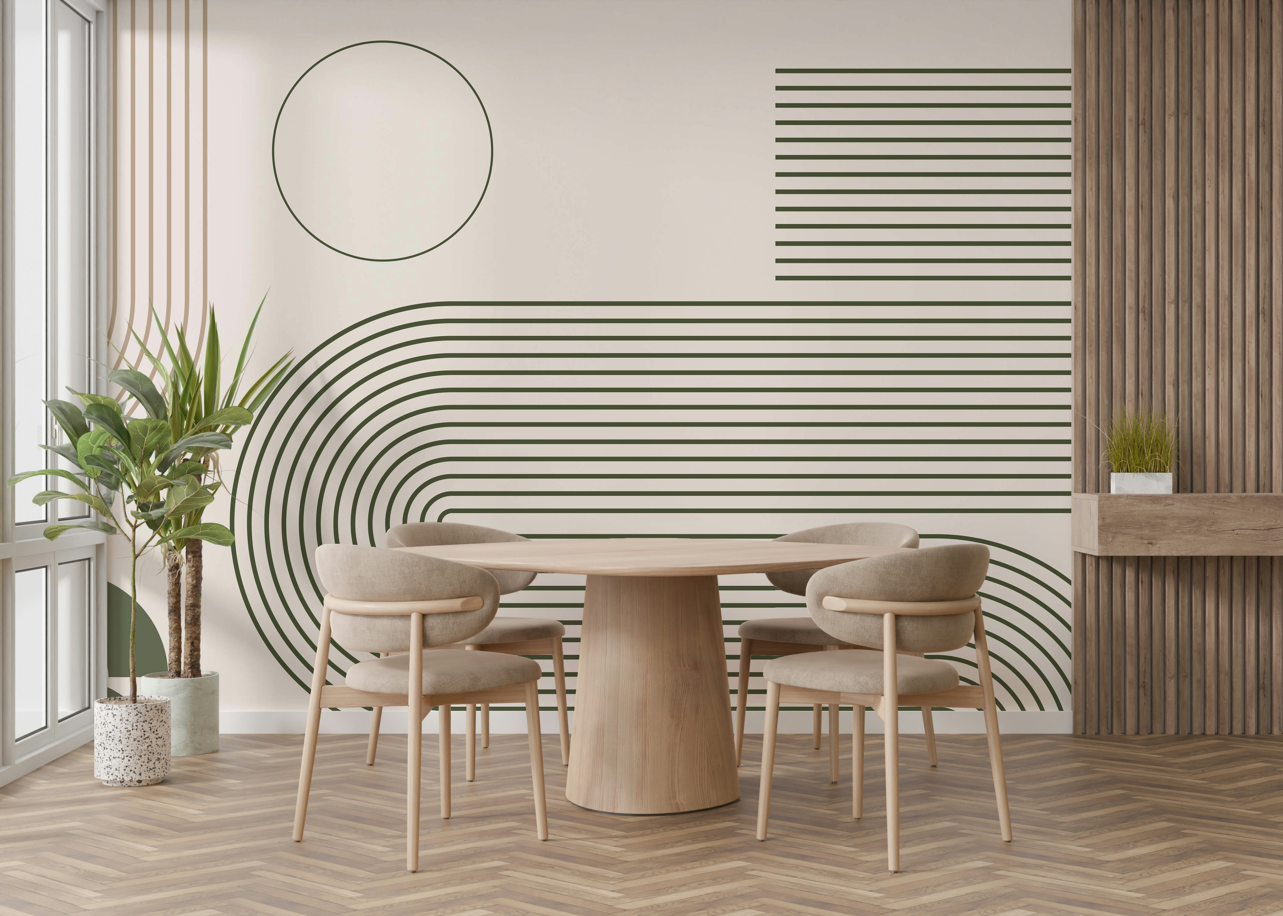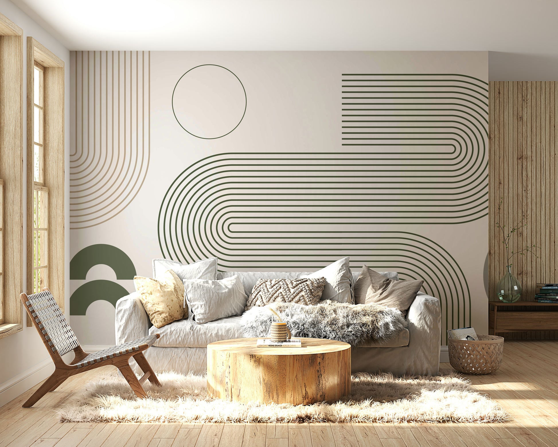 Embrace the serene elegance of 'Minimalist Retro Flow,' a wallpaper design that seamlessly blends retro aesthetics with contemporary minimalism. Subtle curves and parallel lines in calming sage green and beige create a sense of gentle movement and visual flow. Simple geometric shapes, including circles and arches, add depth and visual interest without disrupting the overall calming atmosphere. This wallpaper evokes a feeling of tranquility and sophistication, perfect for modern spaces seeking a touch of understated retro charm.
