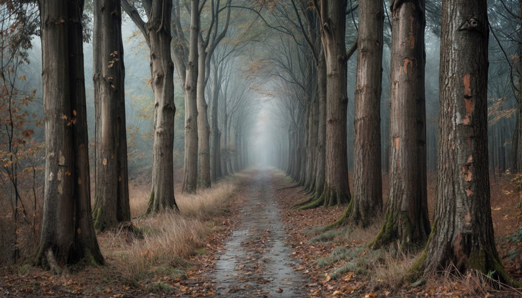 Transform your space with this captivating wallpaper for walls, depicting a serene forest path shrouded in mist. The tall, stately trees create a sense of depth and tranquility, drawing the eye toward an ethereal vanishing point. A palette of muted browns, grays, and subtle greens evokes a sense of calm and sophistication. Ideal for living rooms, bedrooms, or hallways, this design infuses your interior with a touch of nature's mystery. Its quiet elegance will complement both modern and rustic décor styles, enriching the atmosphere of any room.