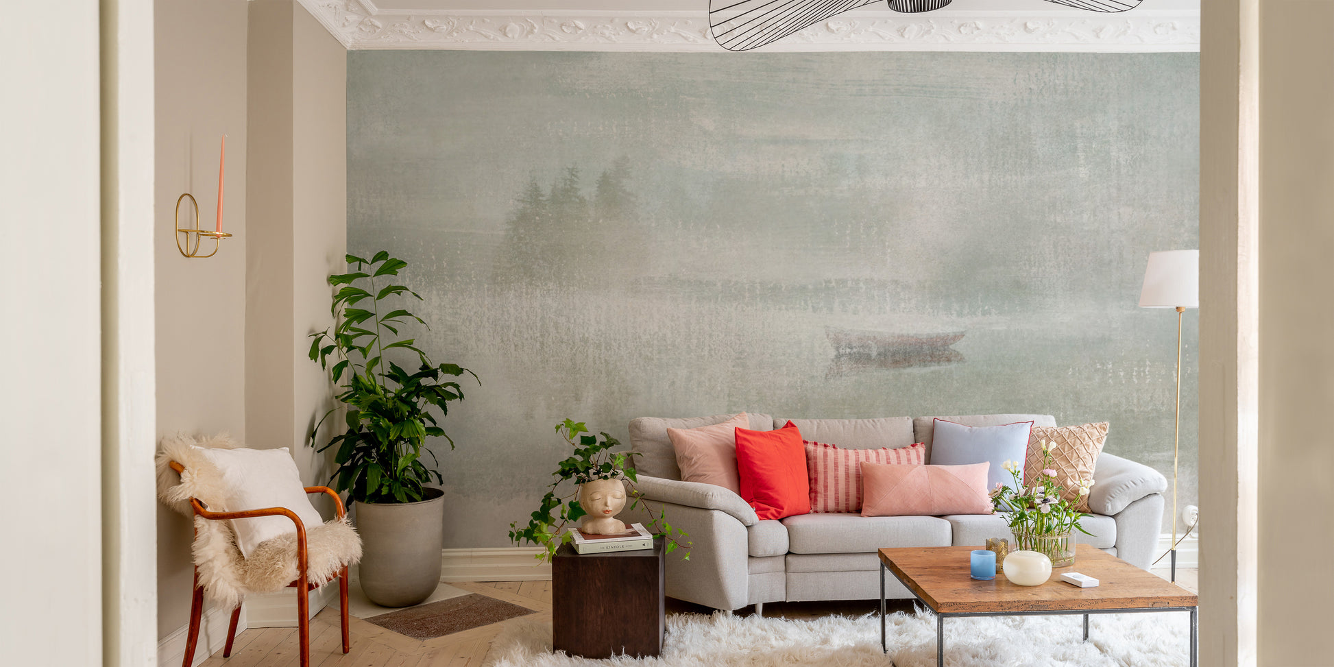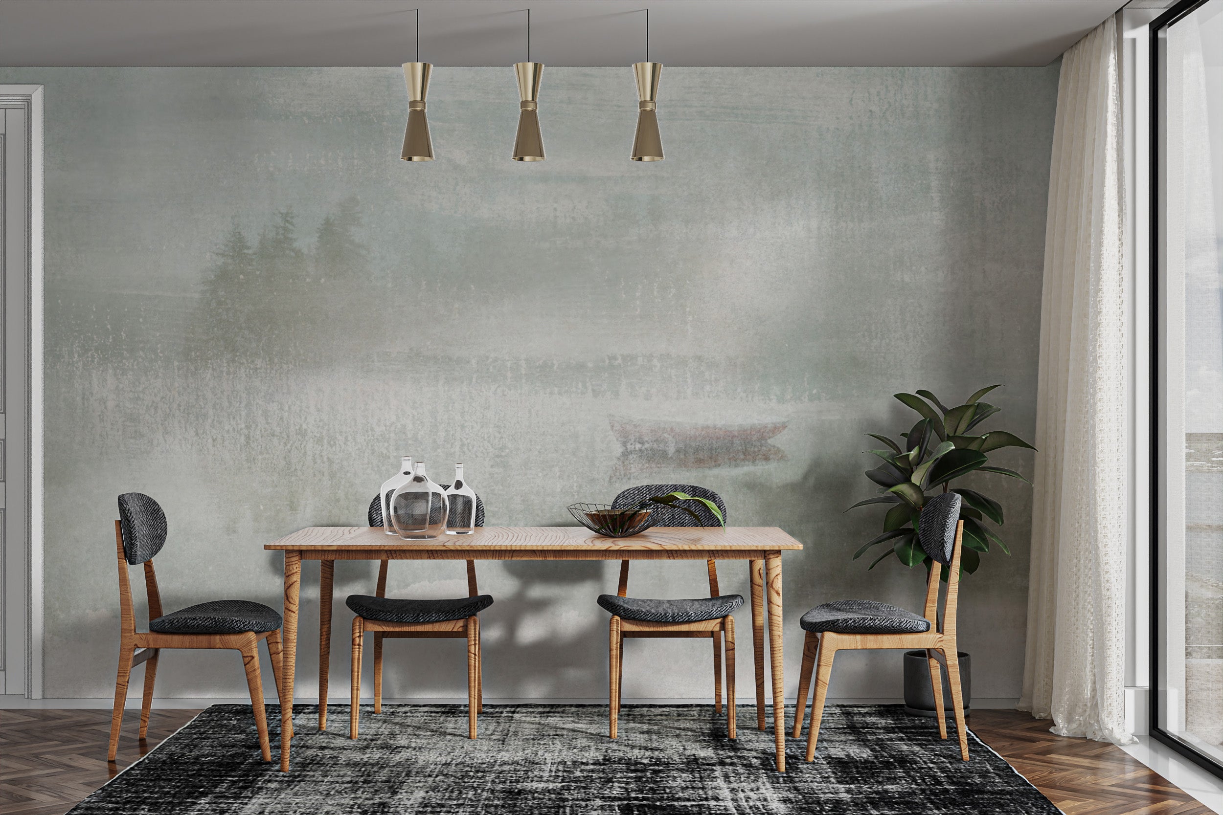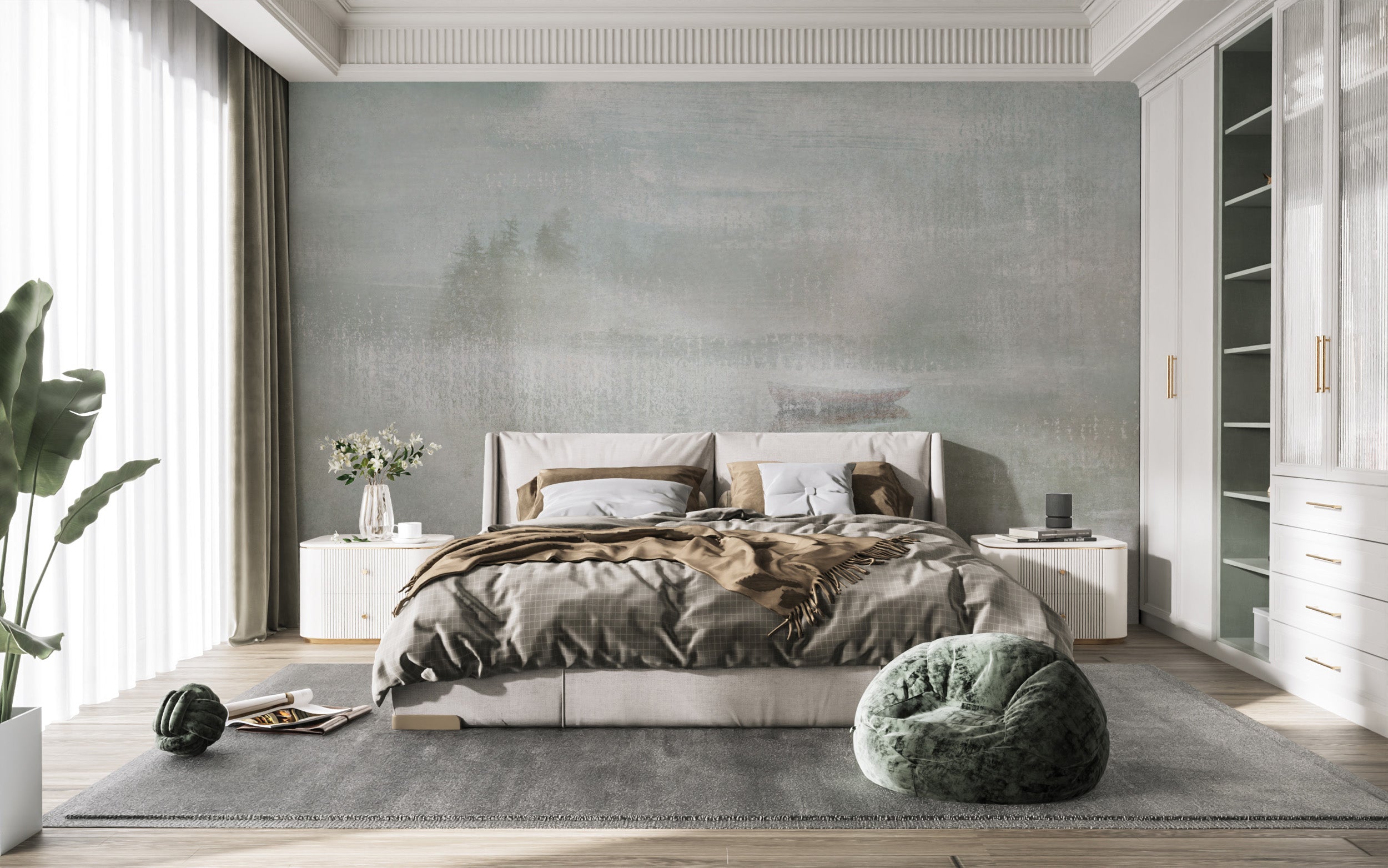 Modern misty lake wallpaper with foggy trees and natural tones