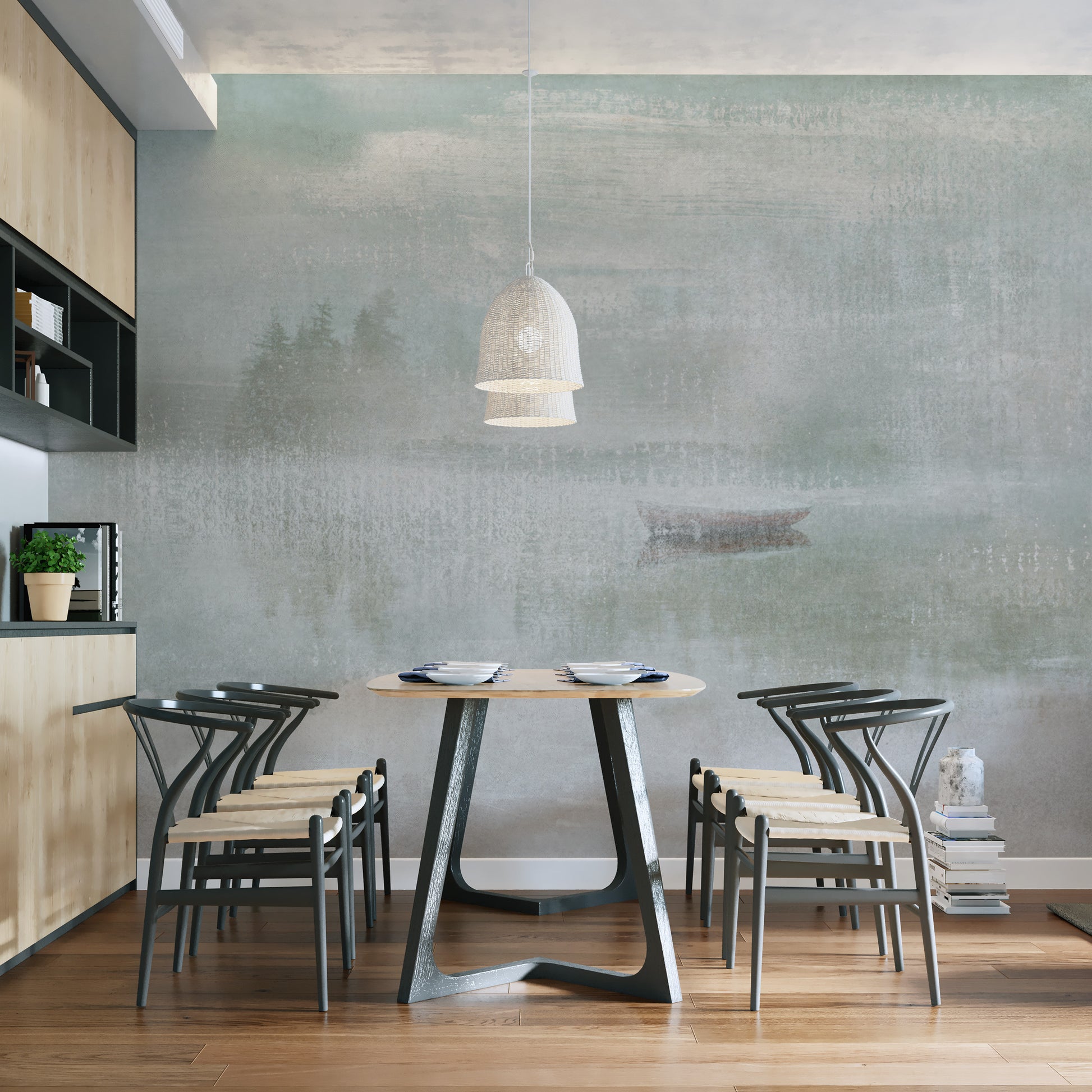 This serene, softly textured green-and-beige colored abstraction and gentle latticework resemble mist at the forest end, along with subtle detail and perfect silhouette in reflections as far as this fragile wooden boat would take itself upon calm misty lake waters, in turn enhancing your place like an aesthetic look at every interior that brings your elegance from refined nature within these abstract creations, so don't delay: have Free Shipping Order today this beautifully decorated piece—misty lake abstract wallpaper.
