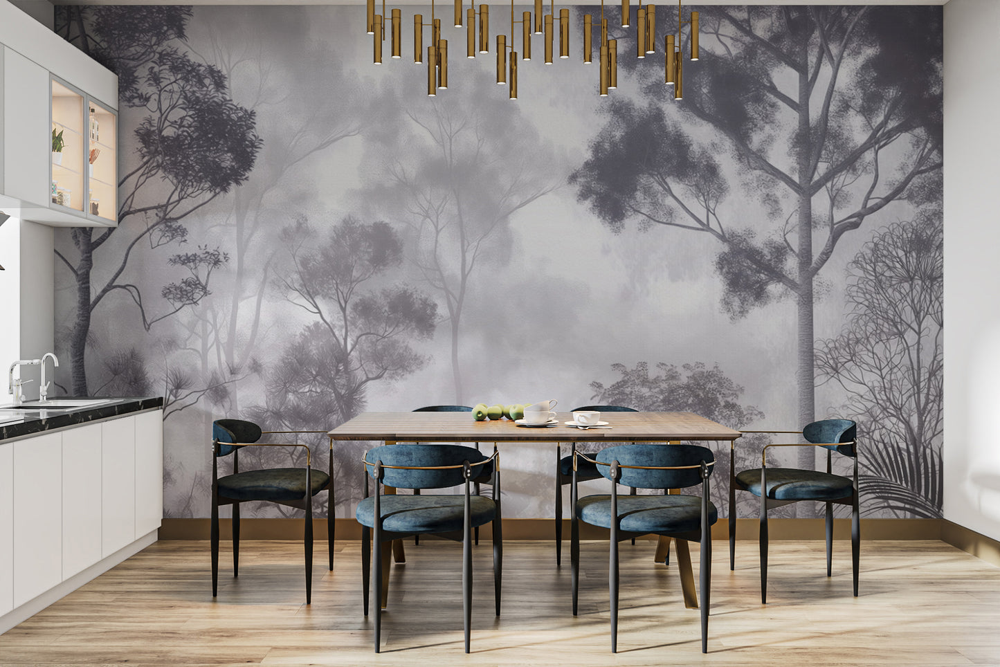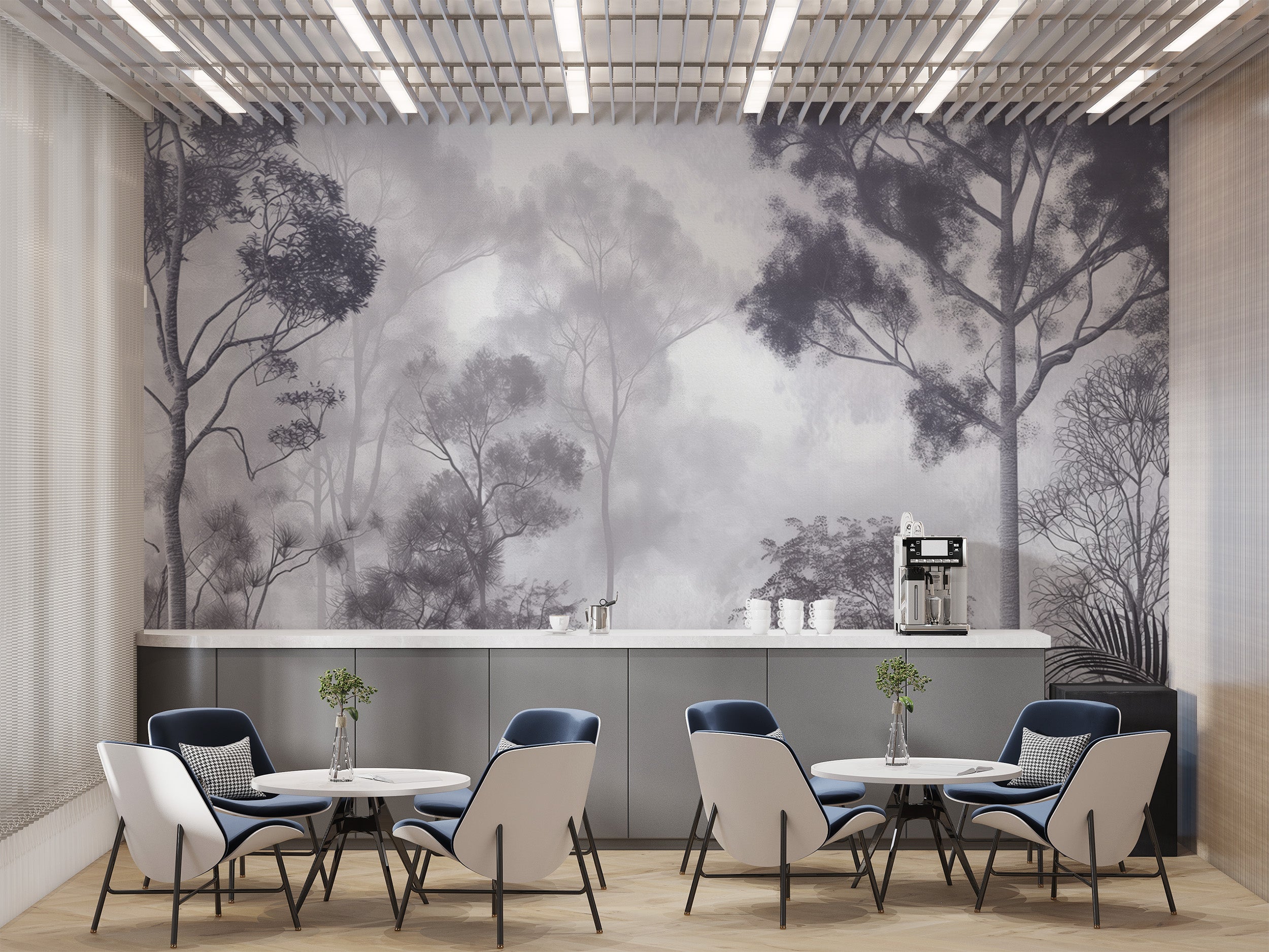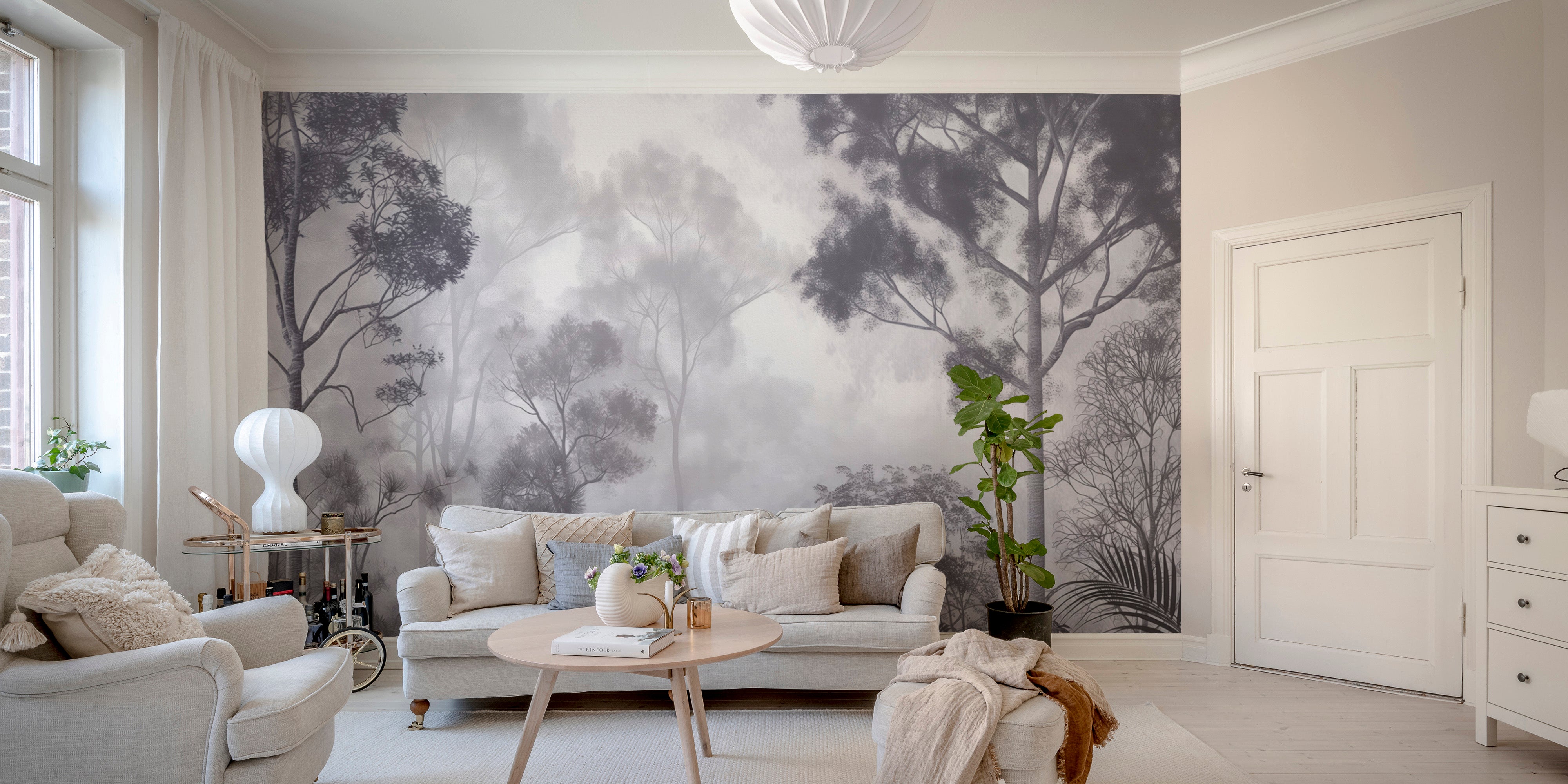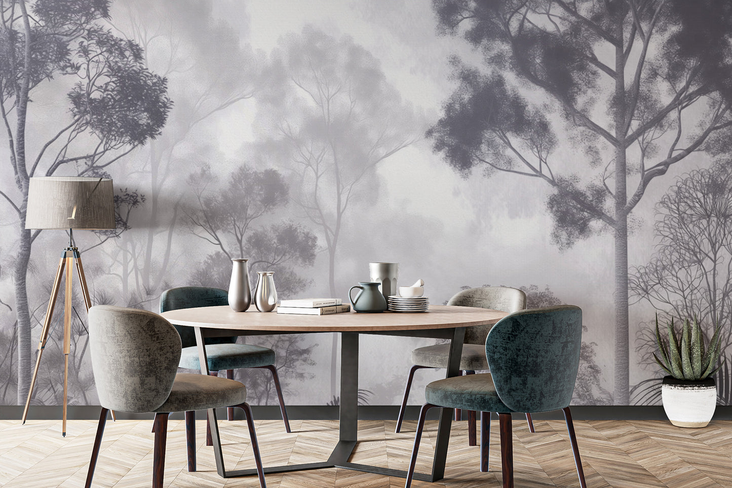 Foggy Woodland Wallpaper with Soft Tree Silhouettes