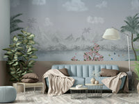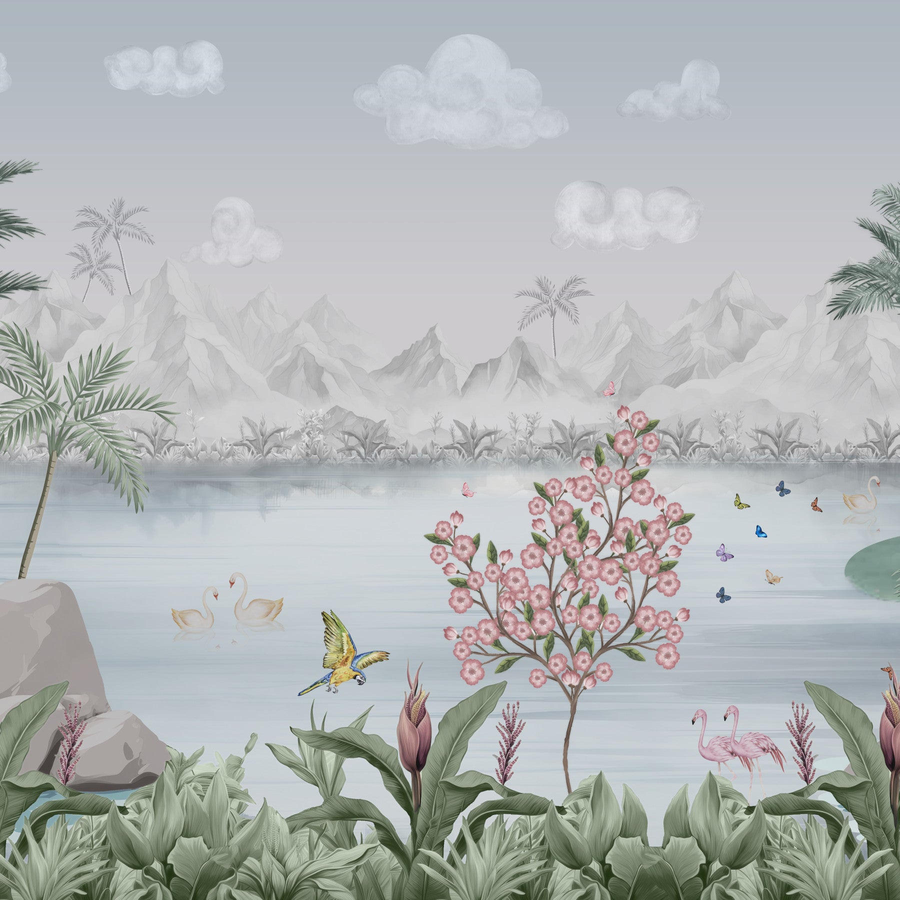 Indulge your senses with this captivating wallpaper showcasing a misty mountain lake scene. The muted tones and soft brushstrokes evoke a sense of calm and tranquility. Lush tropical plants frame the serene waters, where elegant swans glide peacefully. Pink flowering trees add a touch of delicate beauty, while butterflies flutter gently in the air. This design is perfect for adding a touch of sophisticated serenity to your living space.