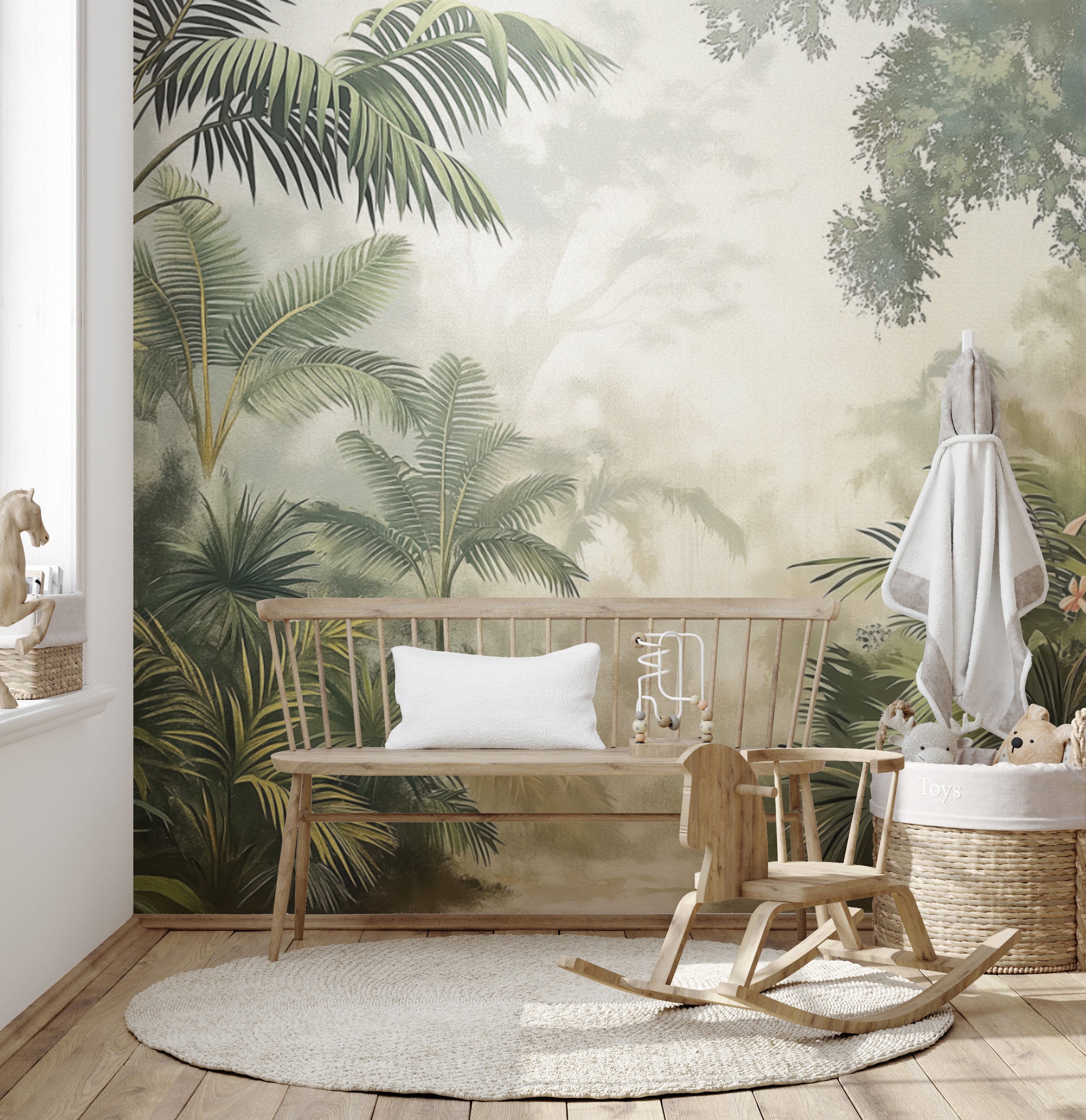 Rainforest-inspired wallpaper with palm trees and soft mist