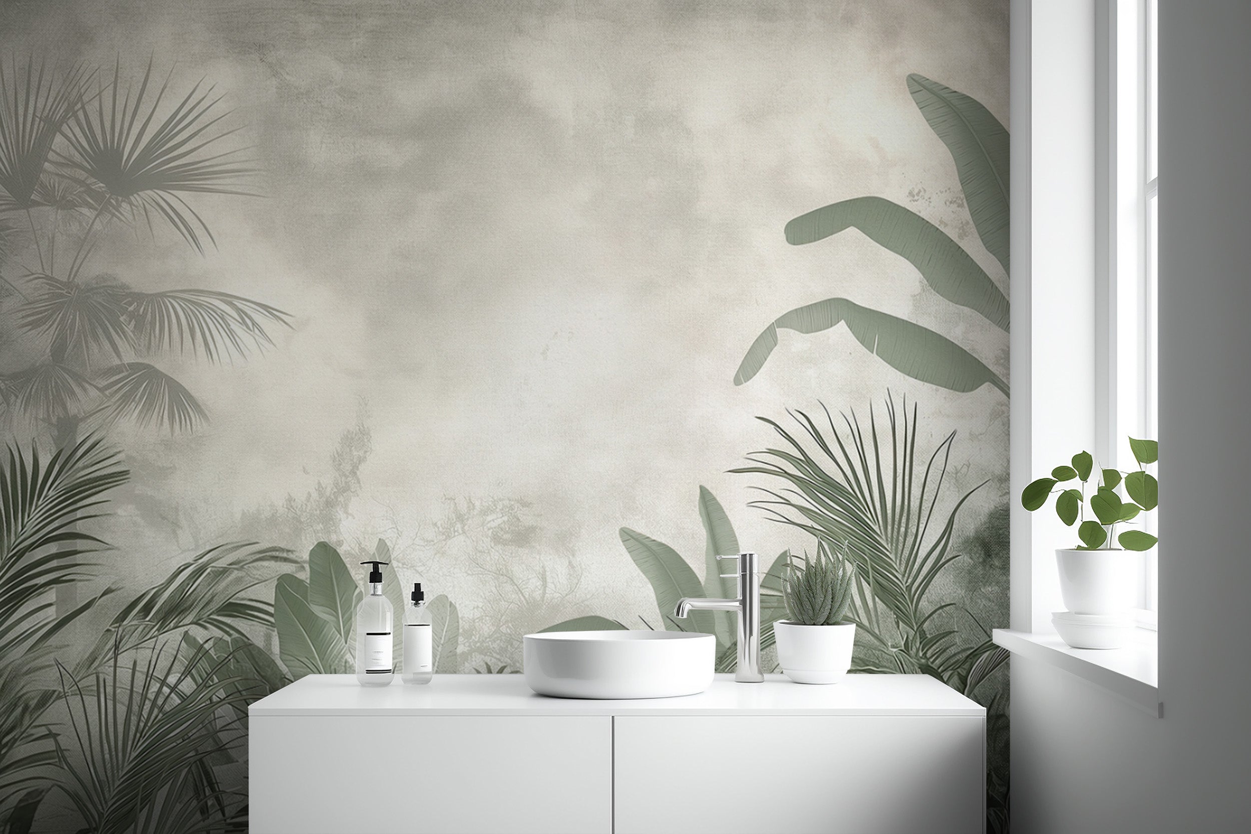 Create a refreshing atmosphere with the misty tropical jungle wall mural, featuring lush greenery wallpaper mural elements and misty tones. The tropical jungle wall mural highlights delicate banana leaves mural details, blending seamlessly with the mist-covered background. The vintage botanical wallpaper mural adds depth, enhancing interiors with a soft, natural feel. Exotic palm wallpaper mural patterns bring organic textures that complement modern and classic styles. The muted tropical foliage wallpaper suits living rooms, bedrooms, and offices. The neutral-toned jungle wallpaper delivers a calming effect, perfect for nature lovers seeking a serene nature-inspired mural with timeless appeal.