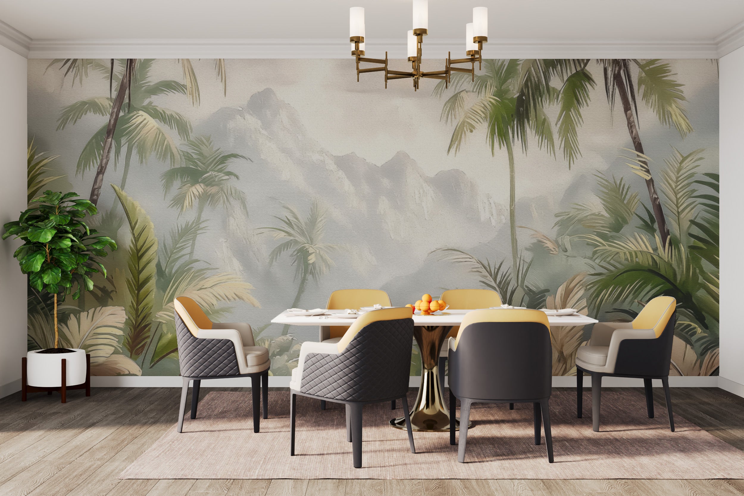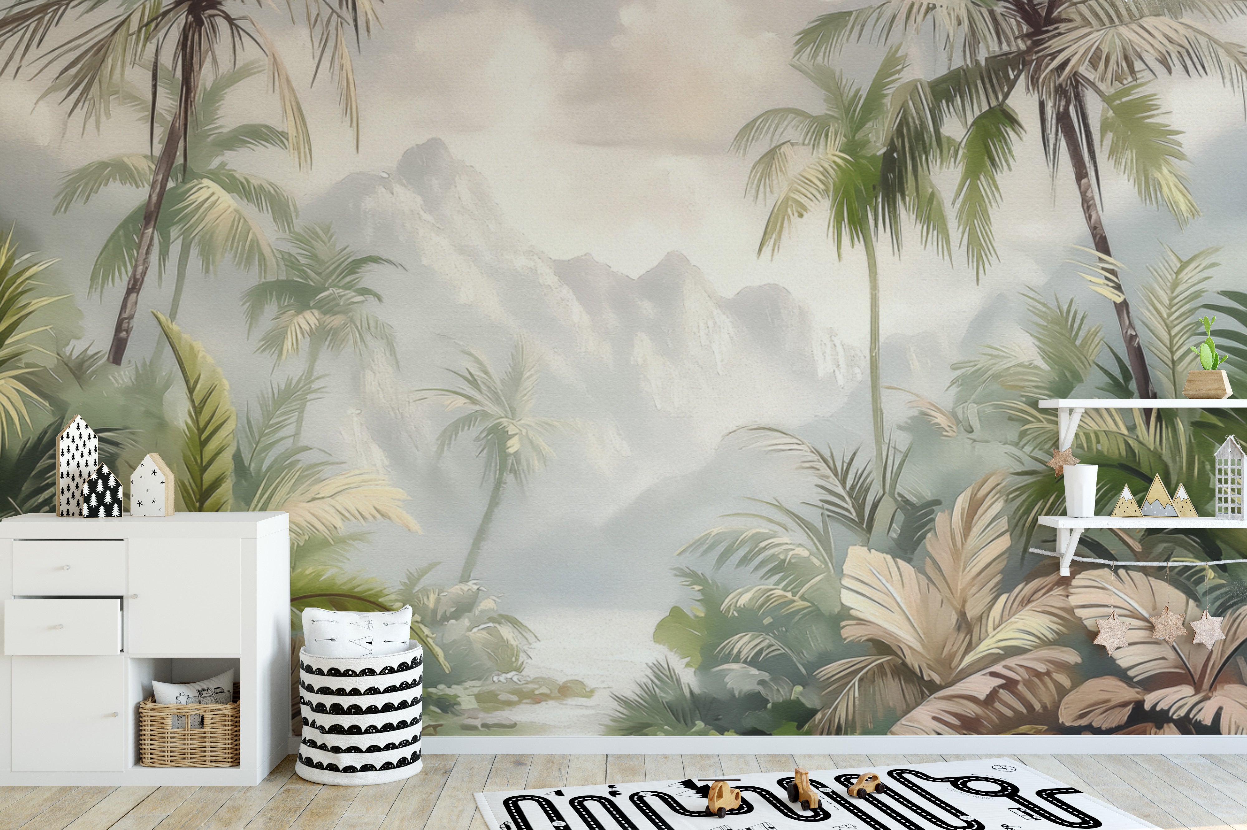 Create a lush paradise with this tropical jungle wallpaper featuring misty mountains and dense palm trees. The soft watercolor tones bring a botanical forest mural effect, adding depth and freshness to any setting. This exotic rainforest wall decor captures nature's beauty with towering palms and layered greenery. Designed to bring an organic feel, this palm tree wallpaper mural suits living rooms, bedrooms, and offices. The misty background blends seamlessly with the foliage, enhancing the illusion of a tropical escape. Experience the essence of nature with this tropical paradise wallpaper, perfect for adding a refreshing, natural element to your walls.