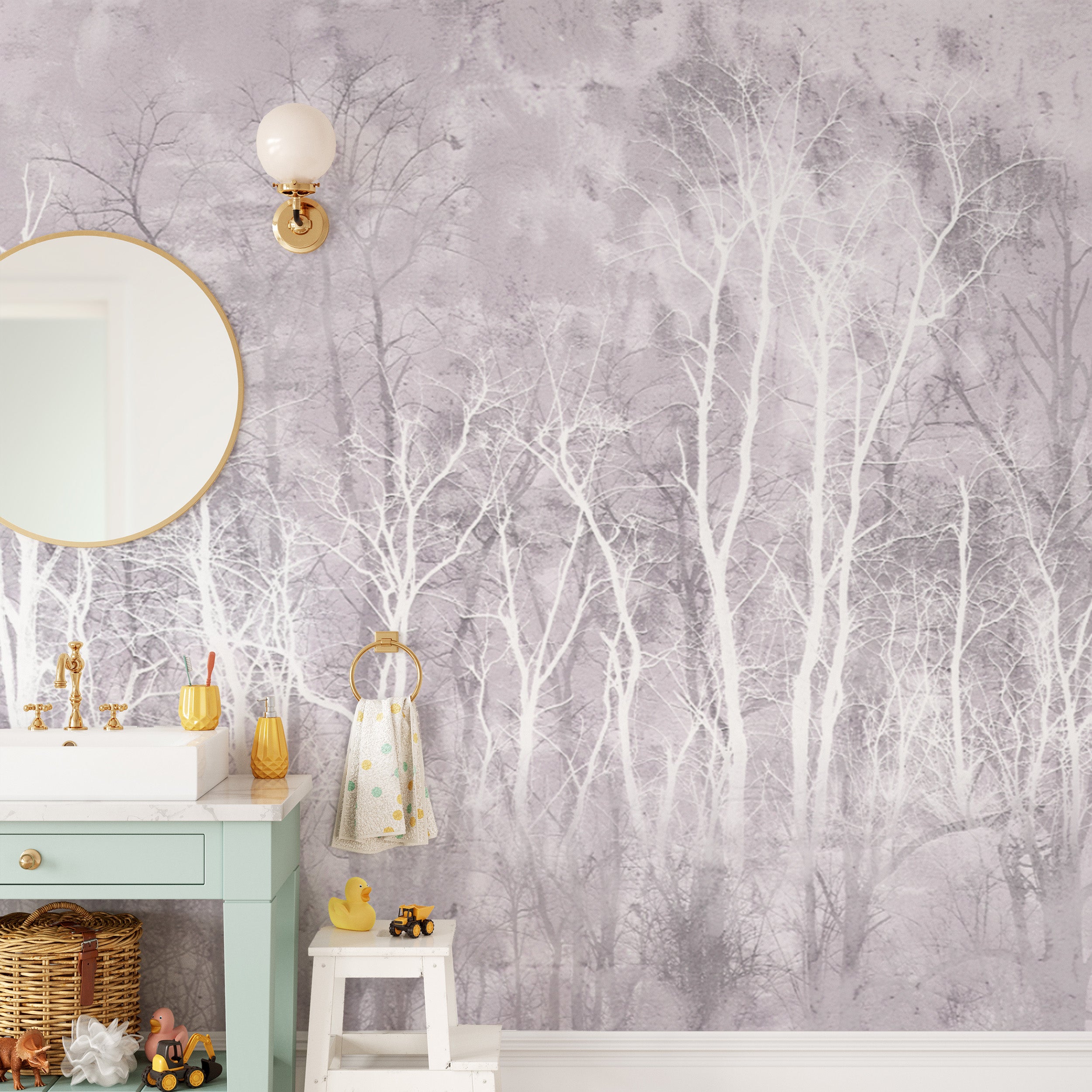 Winter forest wall mural in a muted pastel color palette