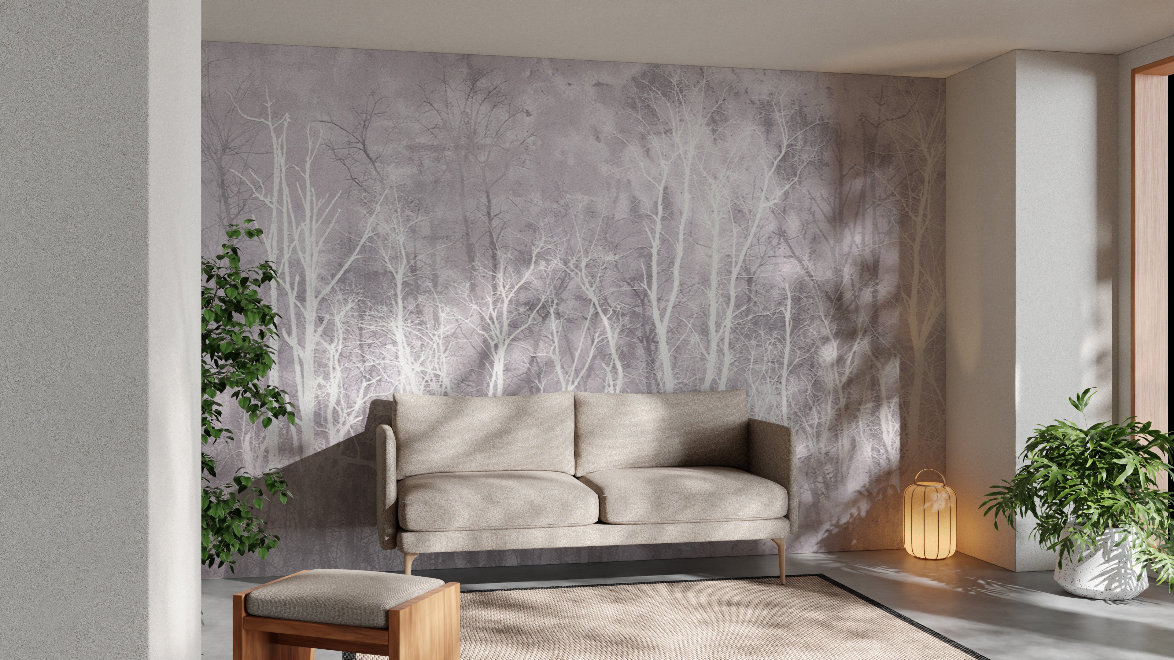 Textured forest wall mural with ethereal, neutral hues