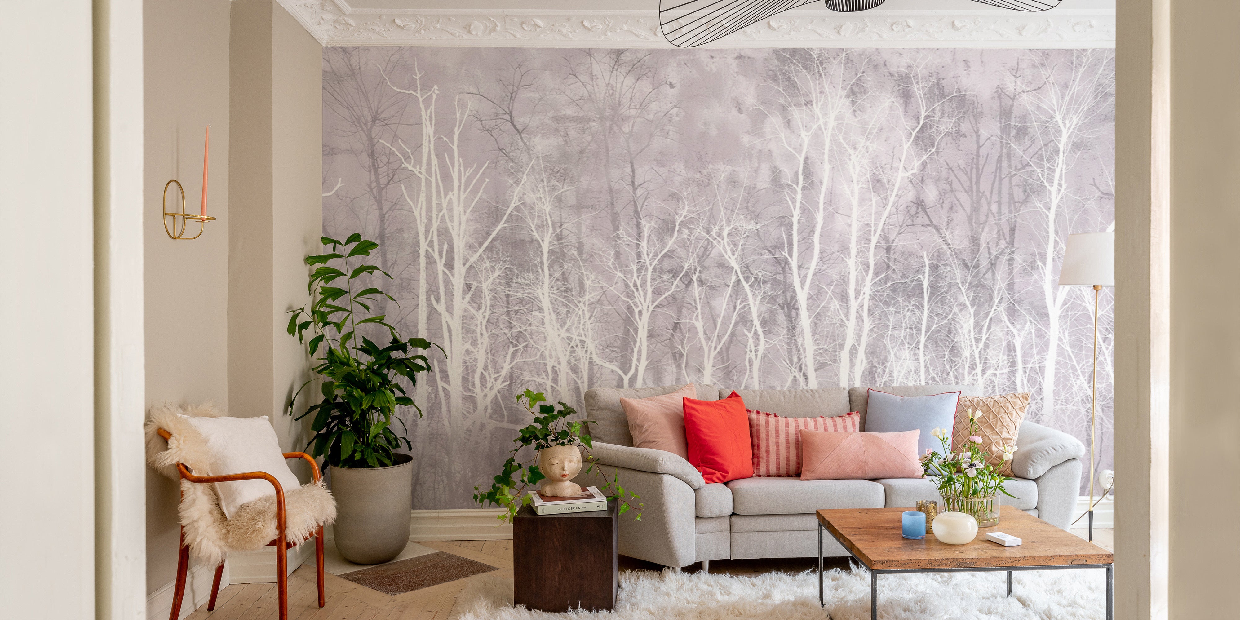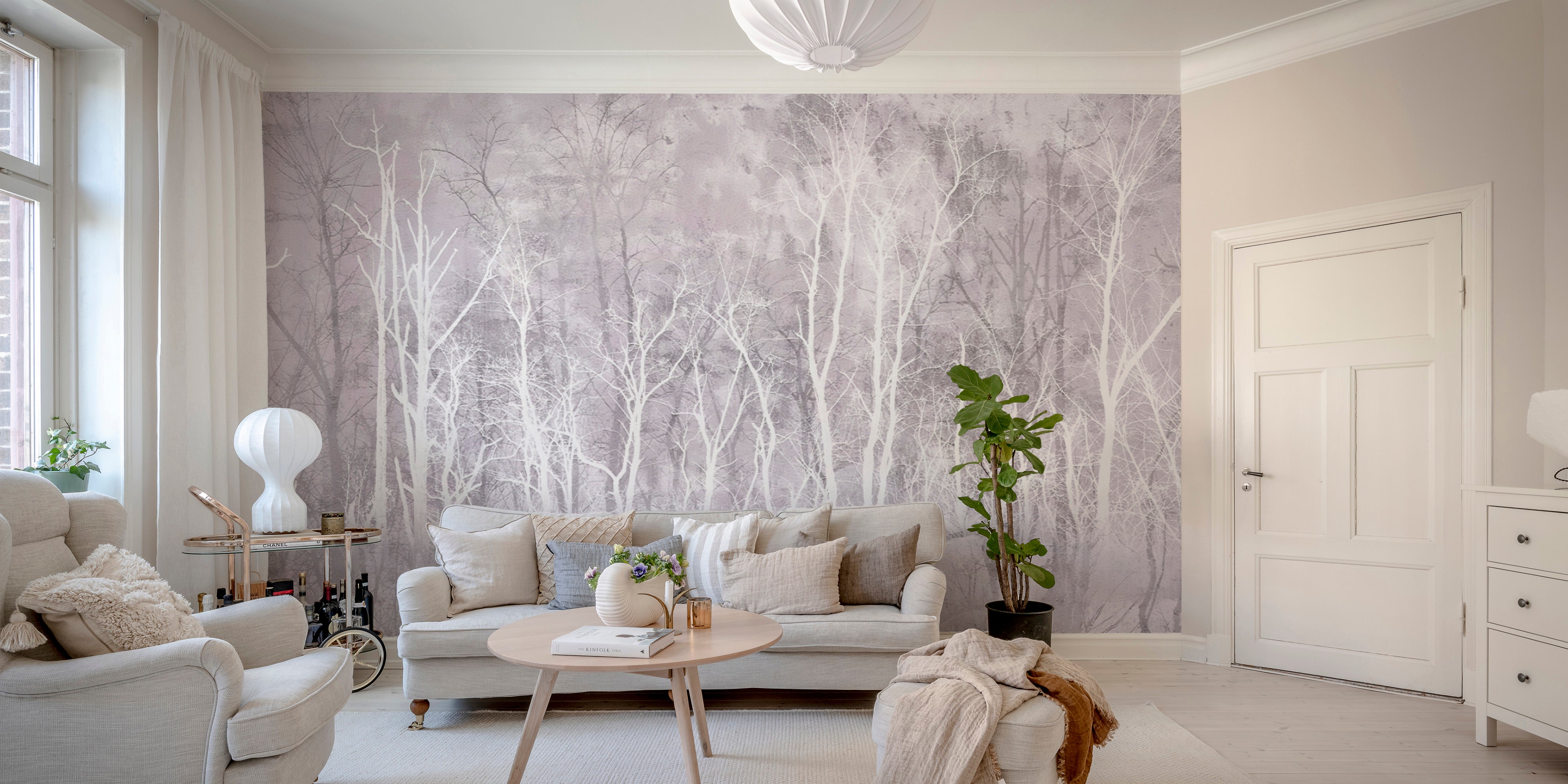 Scandinavian tree wallpaper featuring soft pink and gray tones