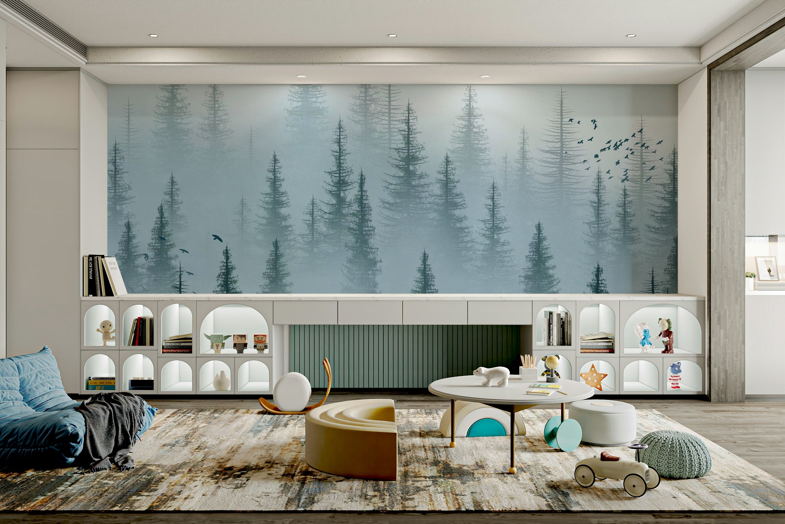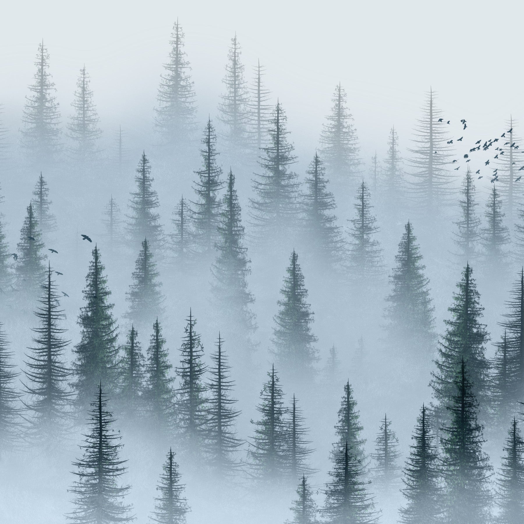 Nature-inspired wall mural of foggy woods
