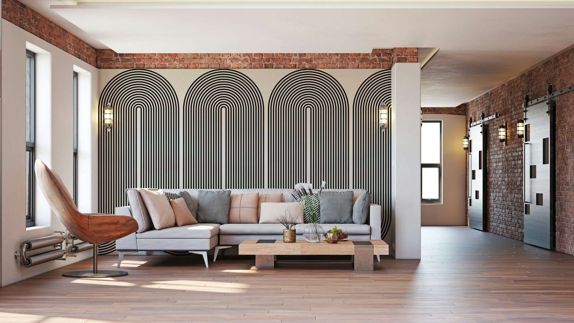 A modern wall mural with a repeating geometric arch pattern.
