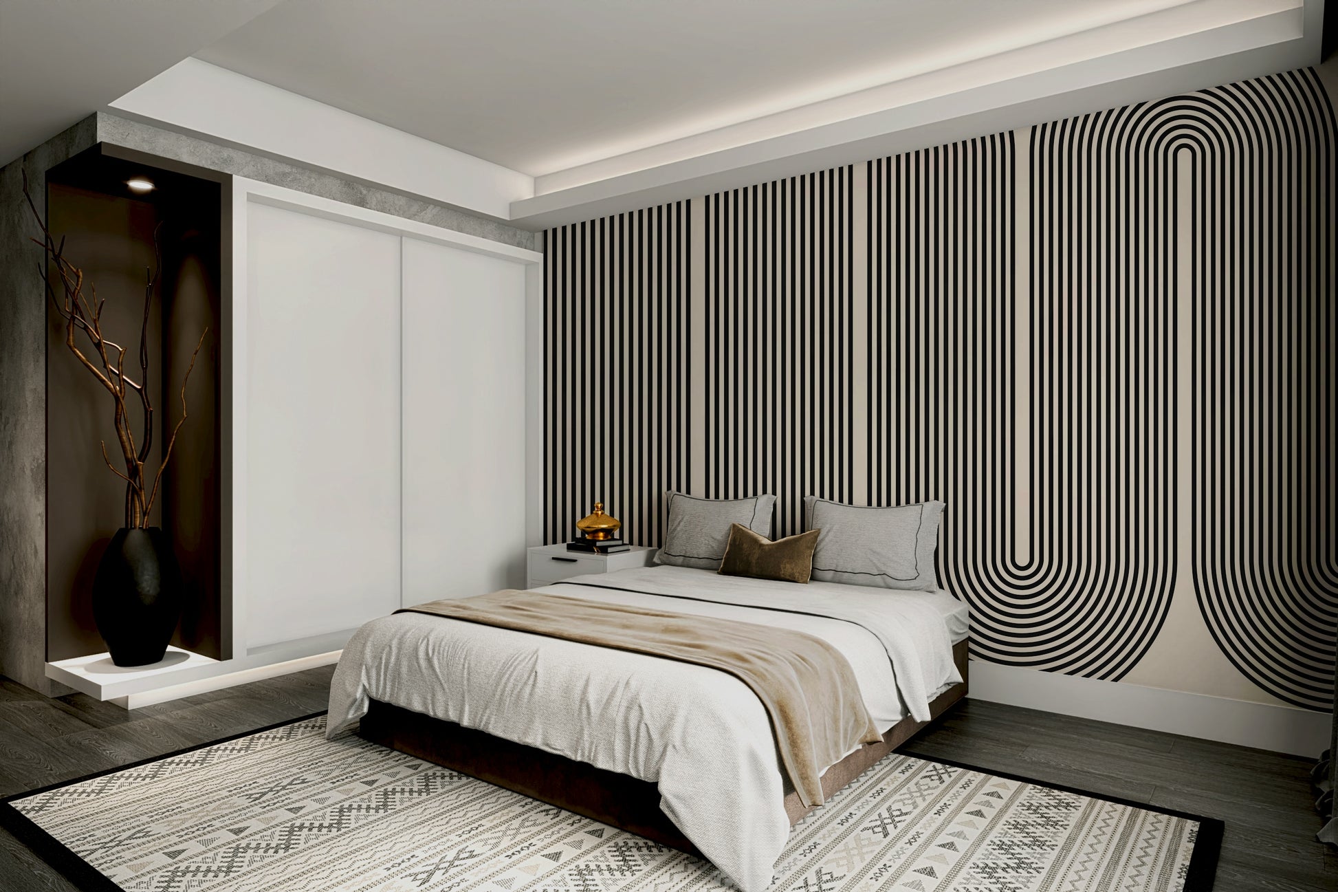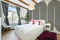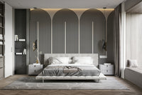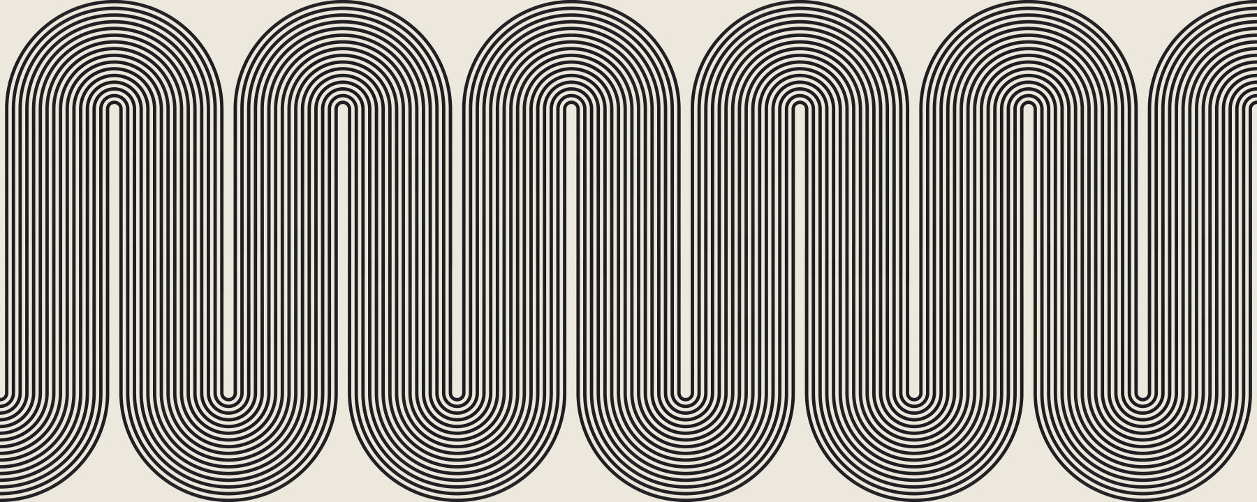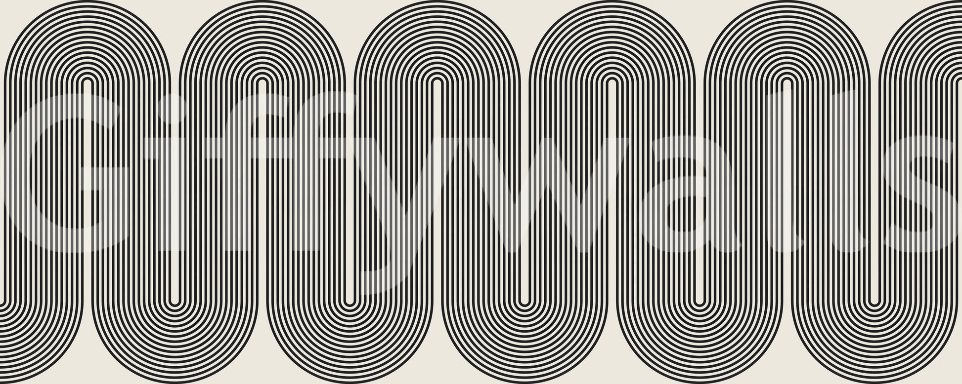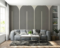 This wallpaper features a captivating pattern of repeating arched shapes made of fine black lines against a light beige backdrop. The result is a strong visual rhythm, providing a sense of movement and depth. Ideal as wallpaper for walls in a modern living room, hallway, or office space, its neutral palette ensures it complements a wide range of furniture and decor styles. The simplicity of the geometric design works well with minimalist or Scandinavian interiors.