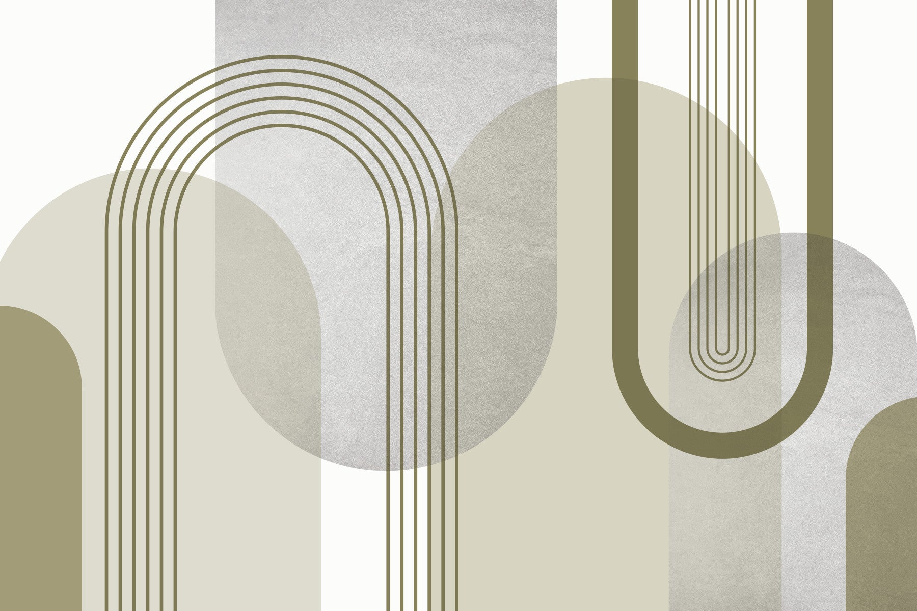 This wallpaper captures the essence of mid-century modern design with its clean lines and organic shapes. The muted palette of beige, olive green, and grey creates a sophisticated yet calming atmosphere. The interplay of curved arches and vertical lines adds a dynamic element to the overall composition, offering a harmonious balance between structure and fluidity. The subtle textures lend depth and warmth, making it a versatile choice for a variety of interior settings – from living rooms and bedrooms to offices seeking a refined aesthetic. The wallpaper's understated elegance speaks to a timeless design sensibility.