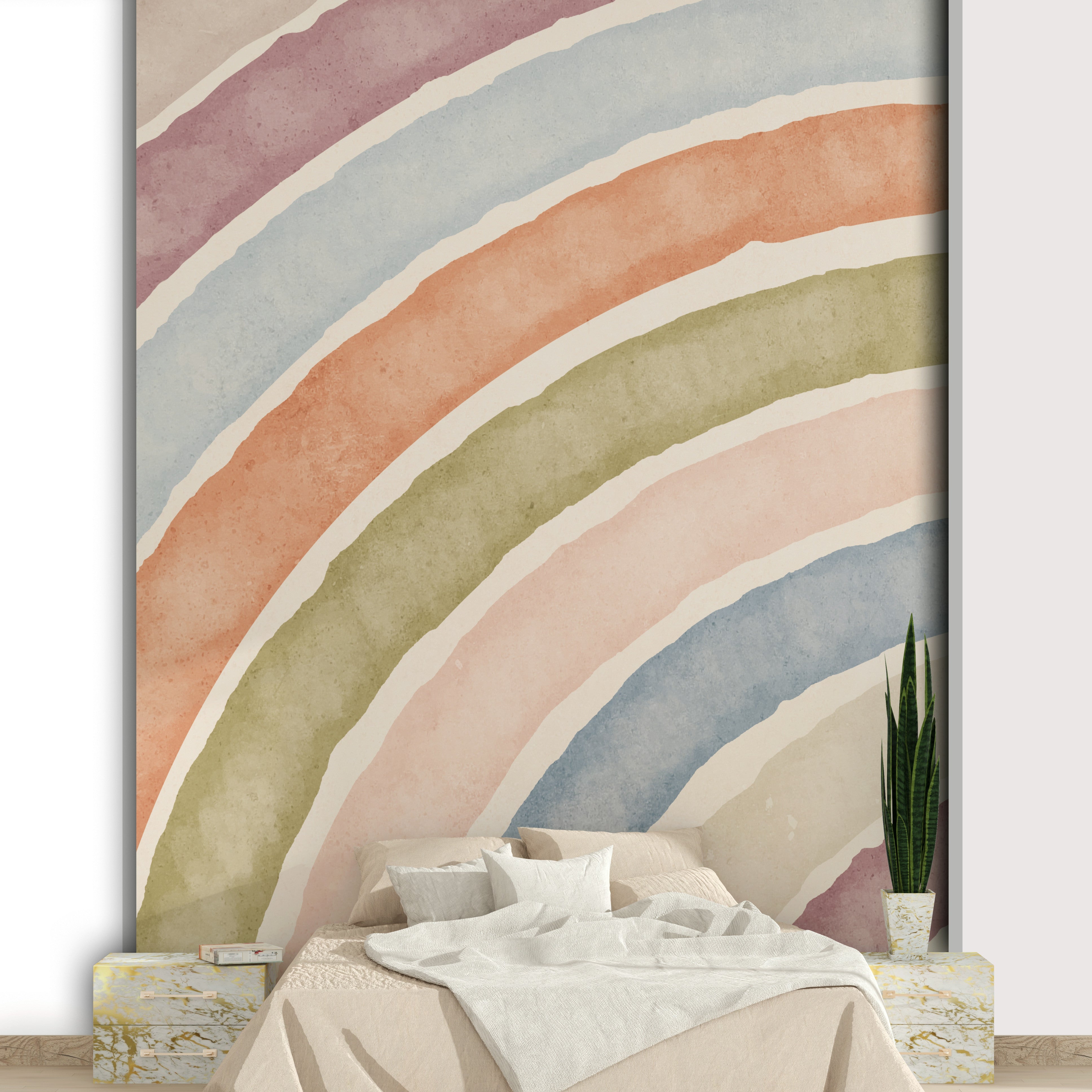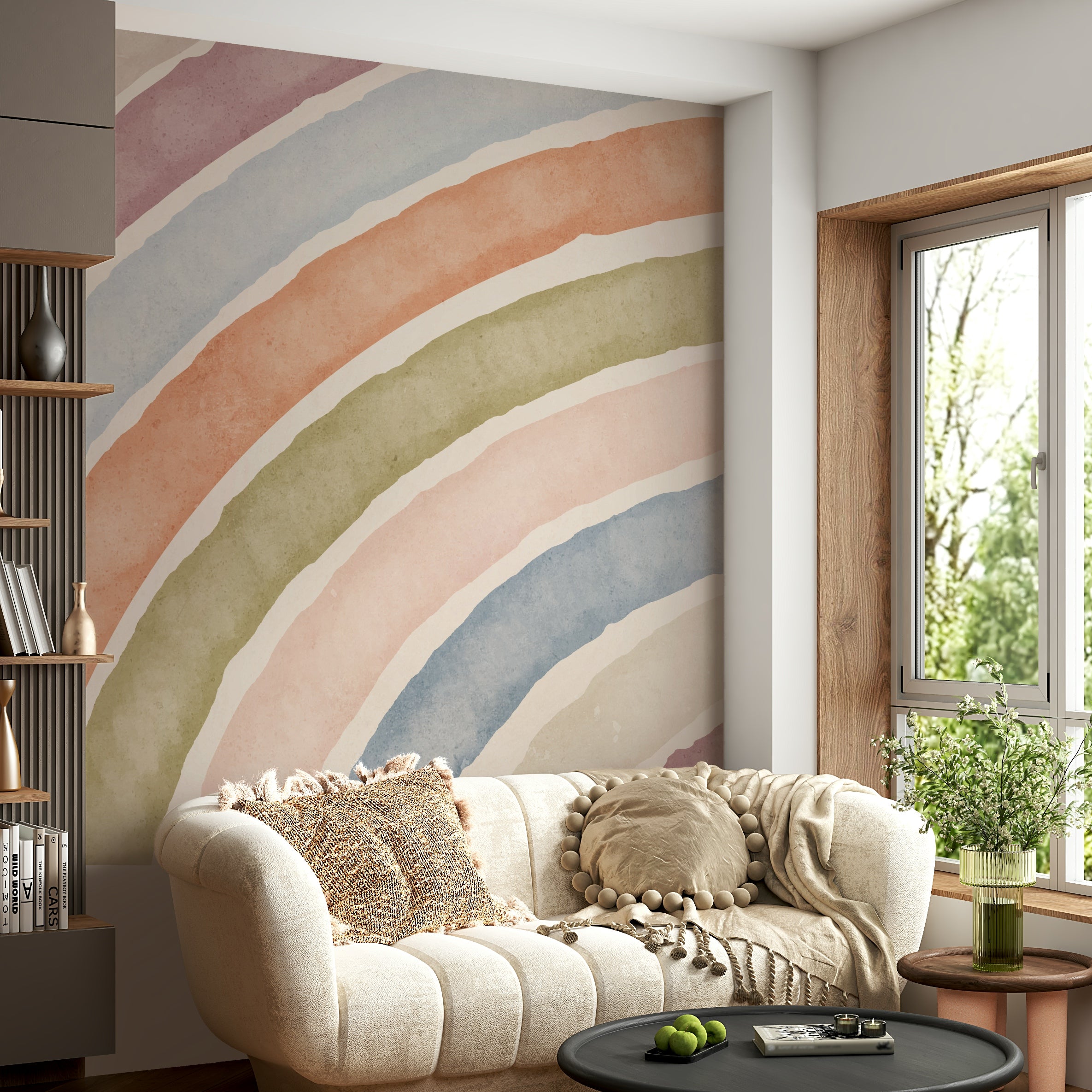 This wallpaper offers a modern take on the classic rainbow theme. The design features a series of elegantly curved arches in a sophisticated palette of muted colors, creating a minimalist yet visually striking effect. The subtle color variations and the smooth transitions between hues evoke a sense of calm and balance. The lack of sharp lines and the soft watercolor texture add to the overall feeling of serenity. This wallpaper is perfect for contemporary interiors, adding a touch of sophistication without being overwhelming.