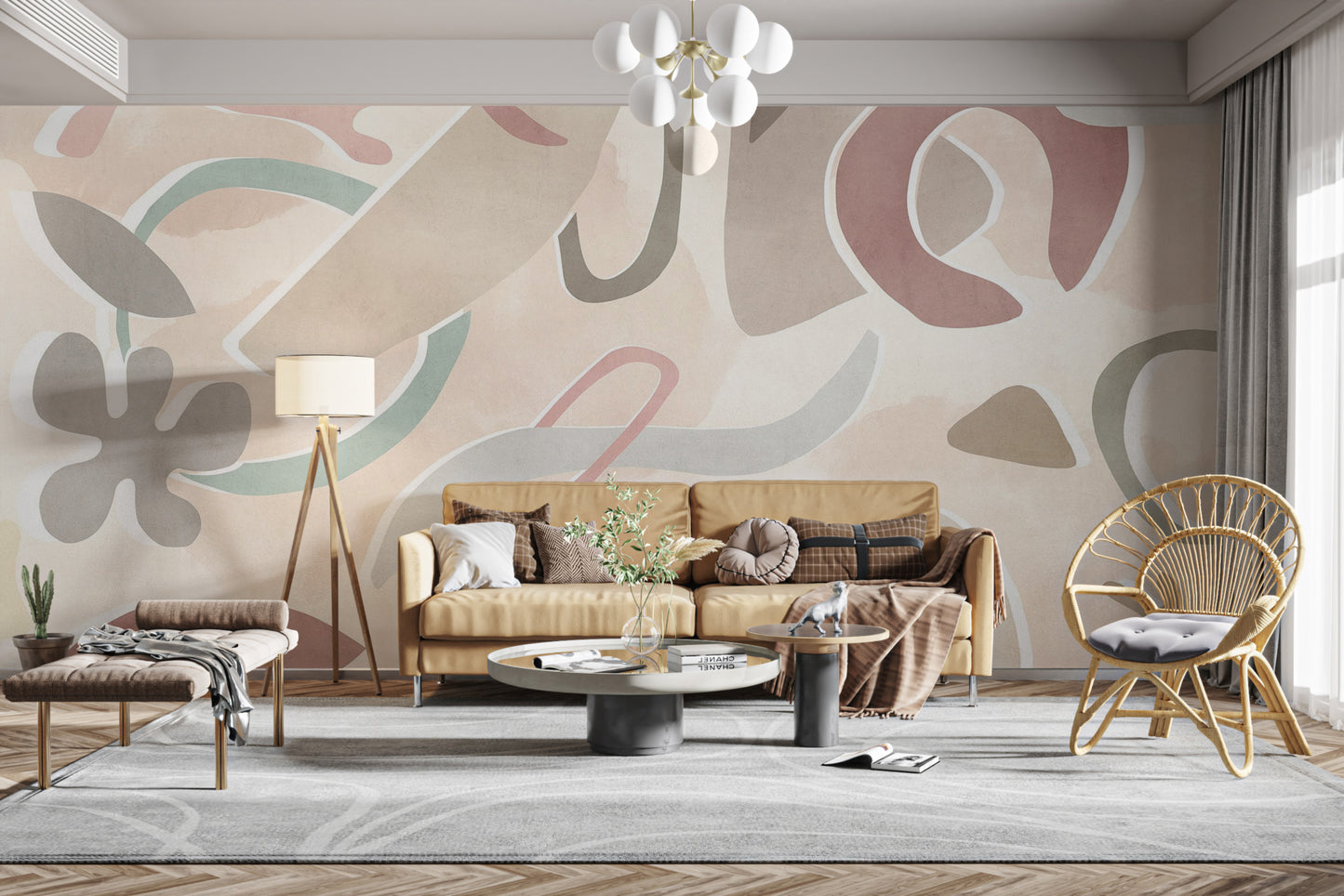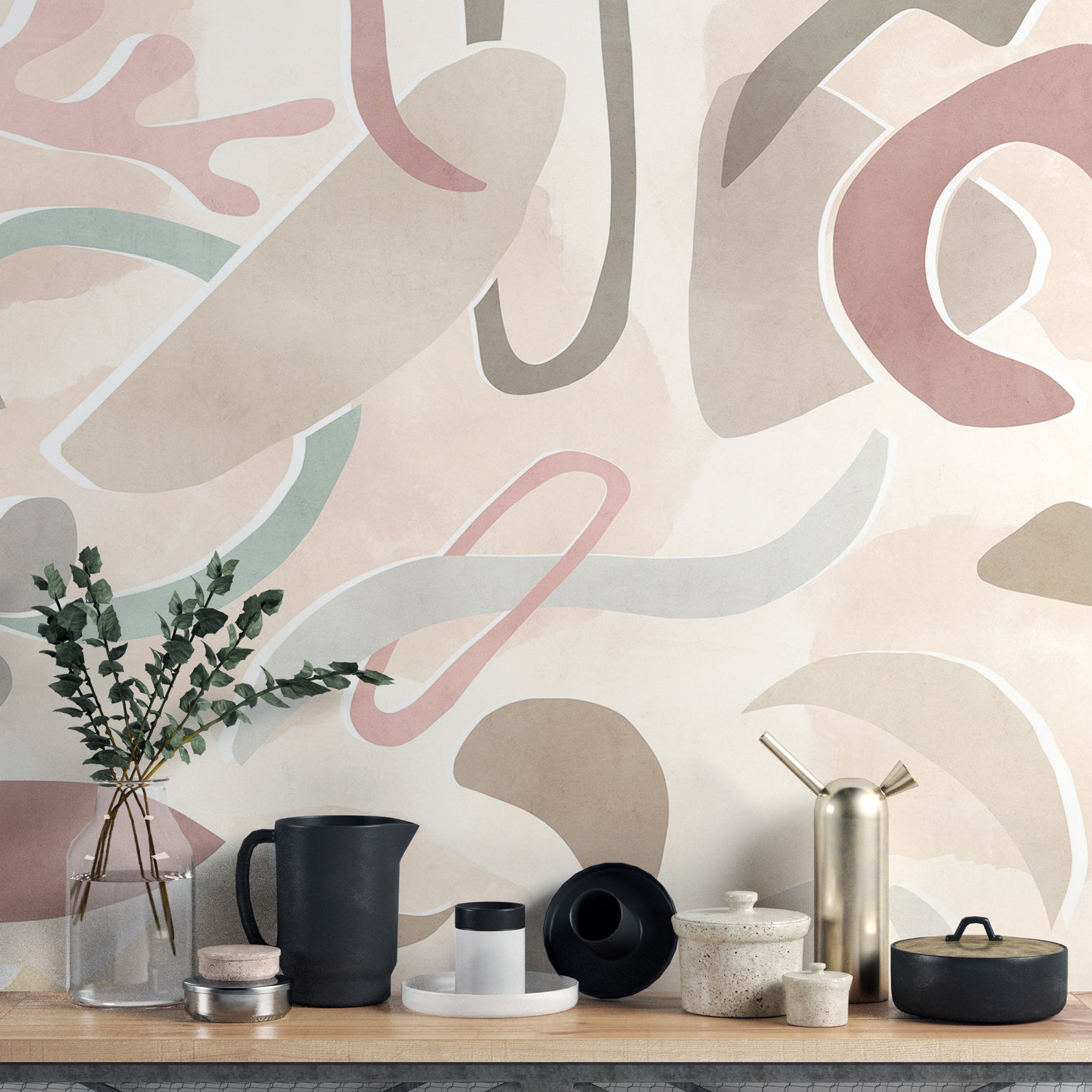The modern pastel abstract wallpaper mural adds a fresh, creative touch to any room. This abstract geometric wallpaper mural blends effortlessly with contemporary and minimalist interiors, featuring soft, organic shapes in muted tones. This modern pastel abstract wallpaper's combination of gentle pinks, beiges, and greens creates a soothing yet dynamic backdrop. Its clean lines and subtle color palette offer a stylish, understated statement. Ideal for living rooms, bedrooms, or offices, the minimalist geometric wall covering brings contemporary charm with its playful yet sophisticated design. Refresh your walls with this soft-tone abstract wallpaper design.