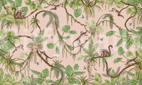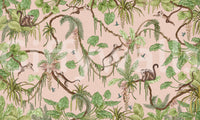 Bring a playful jungle vibe to any room with this delightful design. Monkeys swing among lush, green foliage and delicate hummingbirds, all set against a soft pink background. This wallpaper for walls adds a touch of whimsy and nature-inspired charm. The design complements interiors like nurseries, children's rooms, or even a fun-loving living room. It creates a calm, engaging atmosphere that sparks imagination and a sense of adventure. Let this lively jungle scene transform your space!