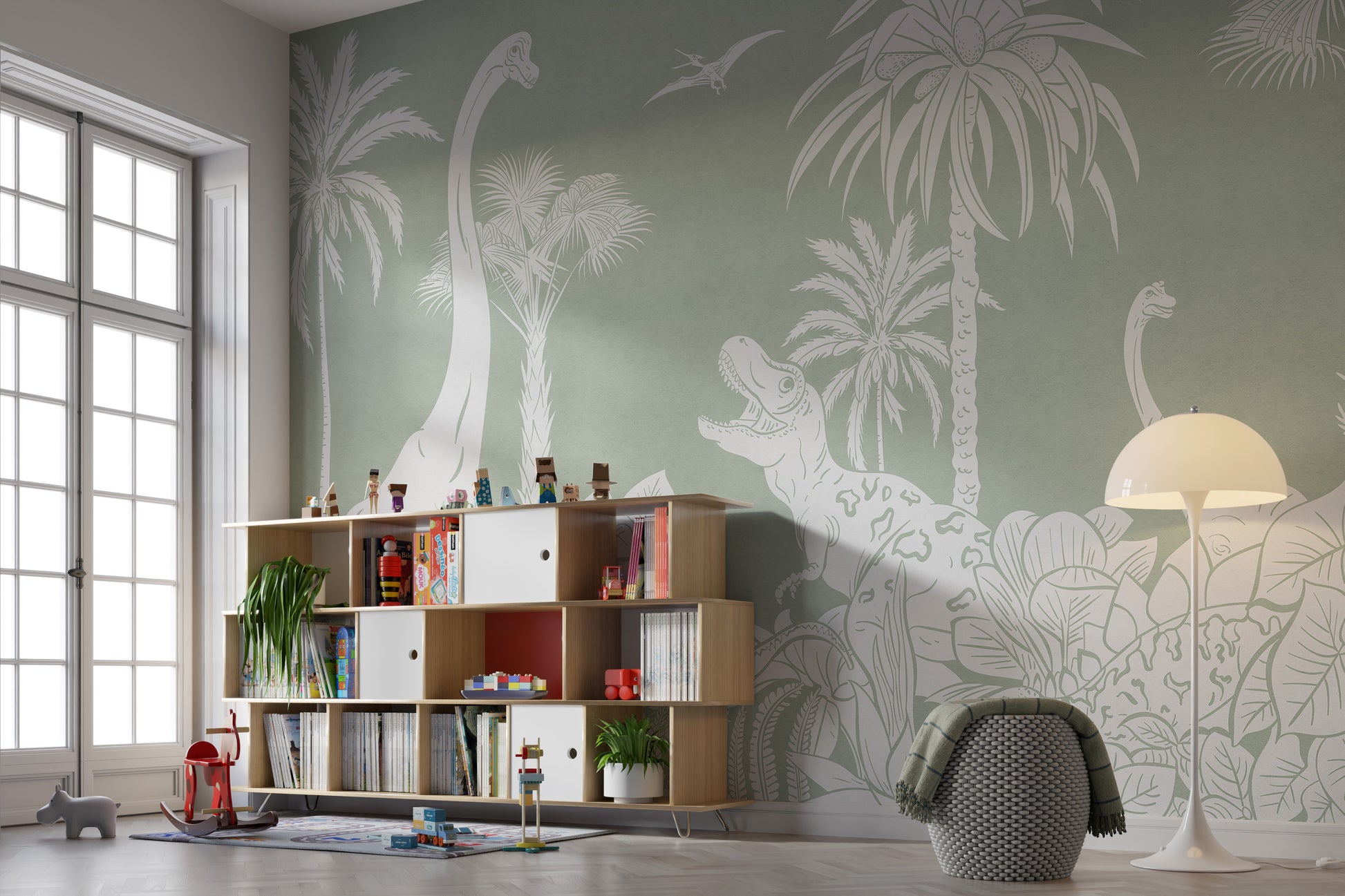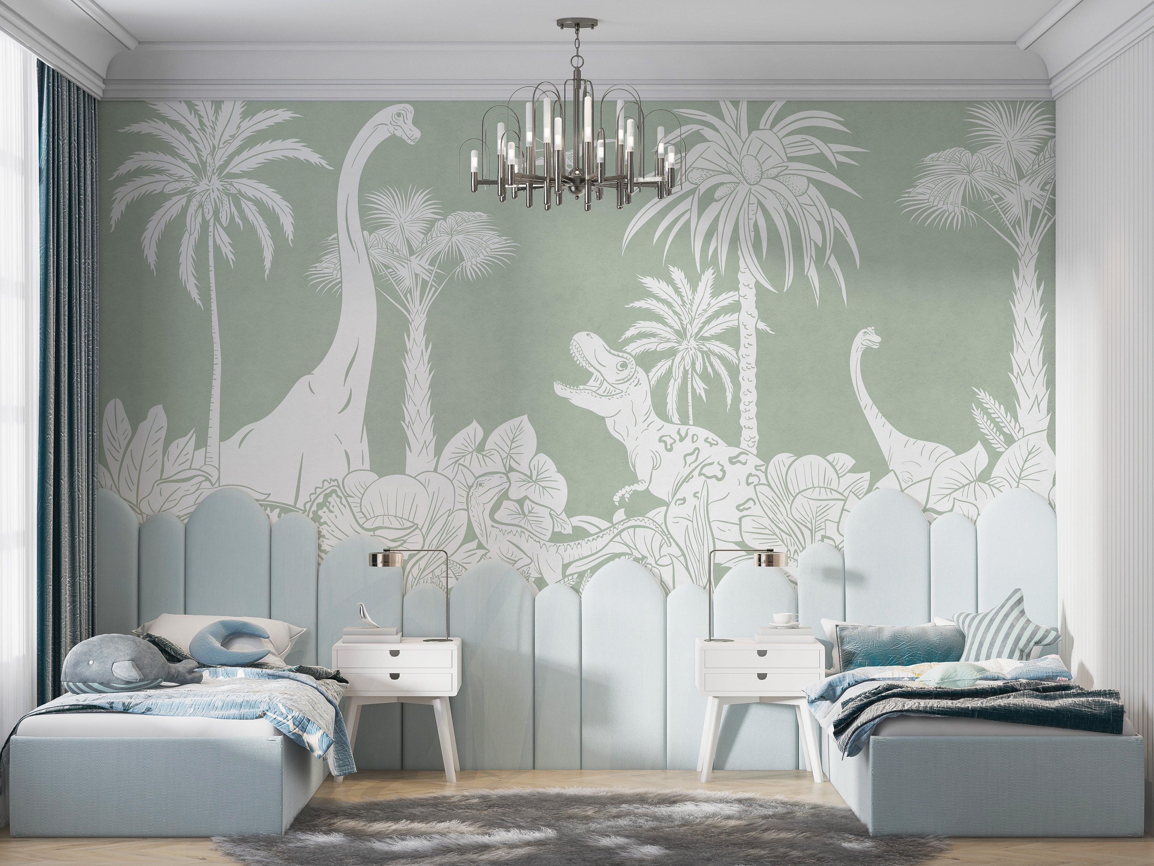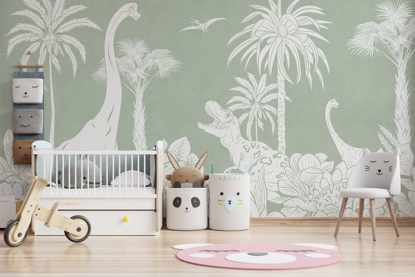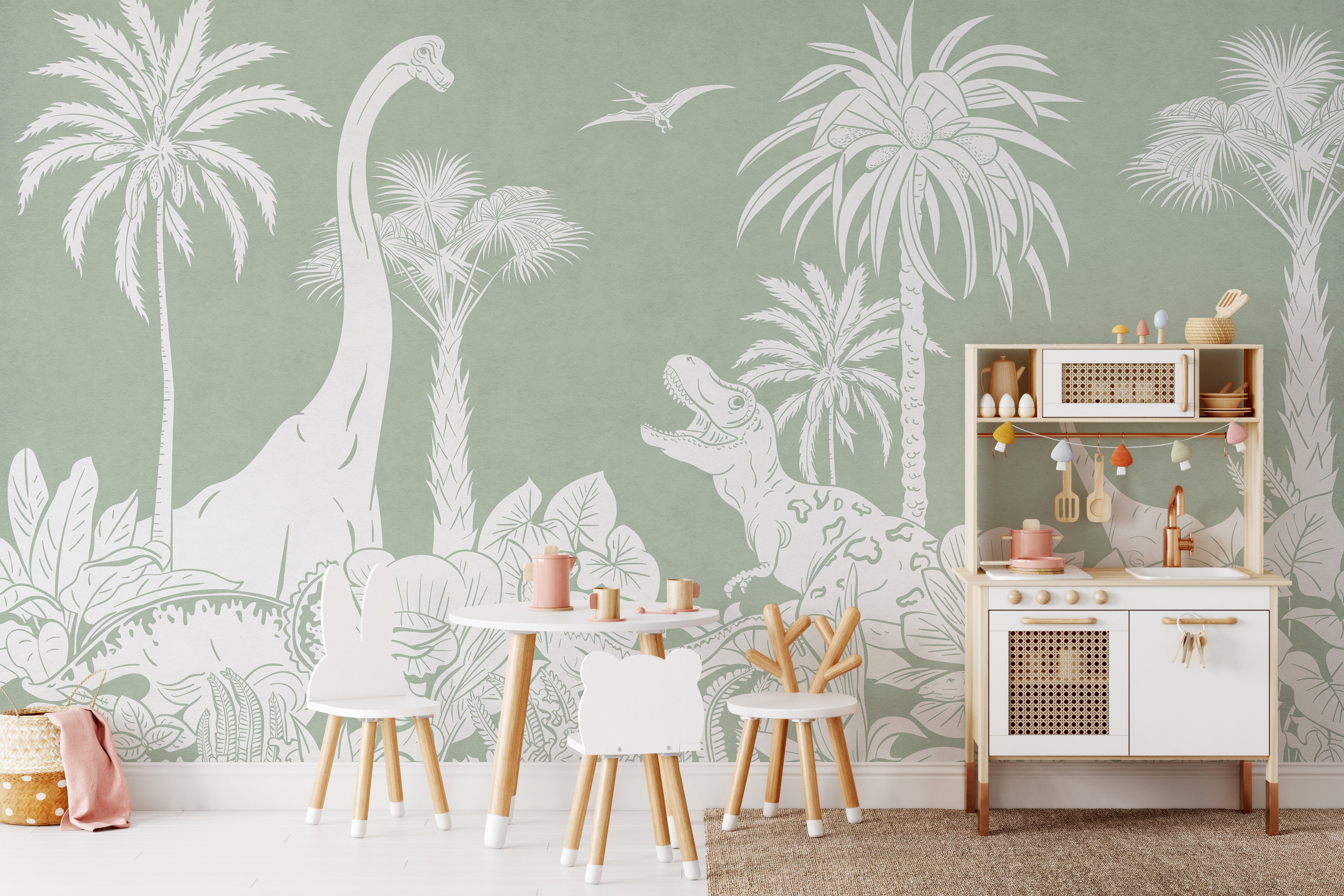 Bring prehistoric adventures to your child's room with the monochrome dino green wall mural. This captivating boys wallpaper features intricate dinosaur illustrations set against a soothing green backdrop, creating an engaging and imaginative environment. Perfect for boys who love dinosaurs, this wall mural adds a touch of excitement and fun to any space. Let your child's imagination run wild as they explore the world of dinosaurs every day. The detailed design and high-quality material ensure durability and vibrant colours, making it a great addition to your home. Order now and give your child the room of their dreams.