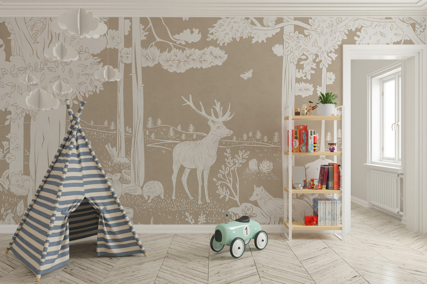 Enhance your kids room with the delightful monochrome forest brown wall mural. This captivating wallpaper depicts a serene forest scene, complete with deer, foxes, and owls, intricately designed in monochrome brown. The tranquil woodland imagery offers a soothing ambiance, ideal for a relaxing and imaginative environment. Perfect for nurturing a love for nature, this mural transforms your kids' room into a picturesque forest setting, where they can embark on endless adventures. The unique design adds a touch of whimsy and wonder to their space, making it a truly special place to grow and dream.