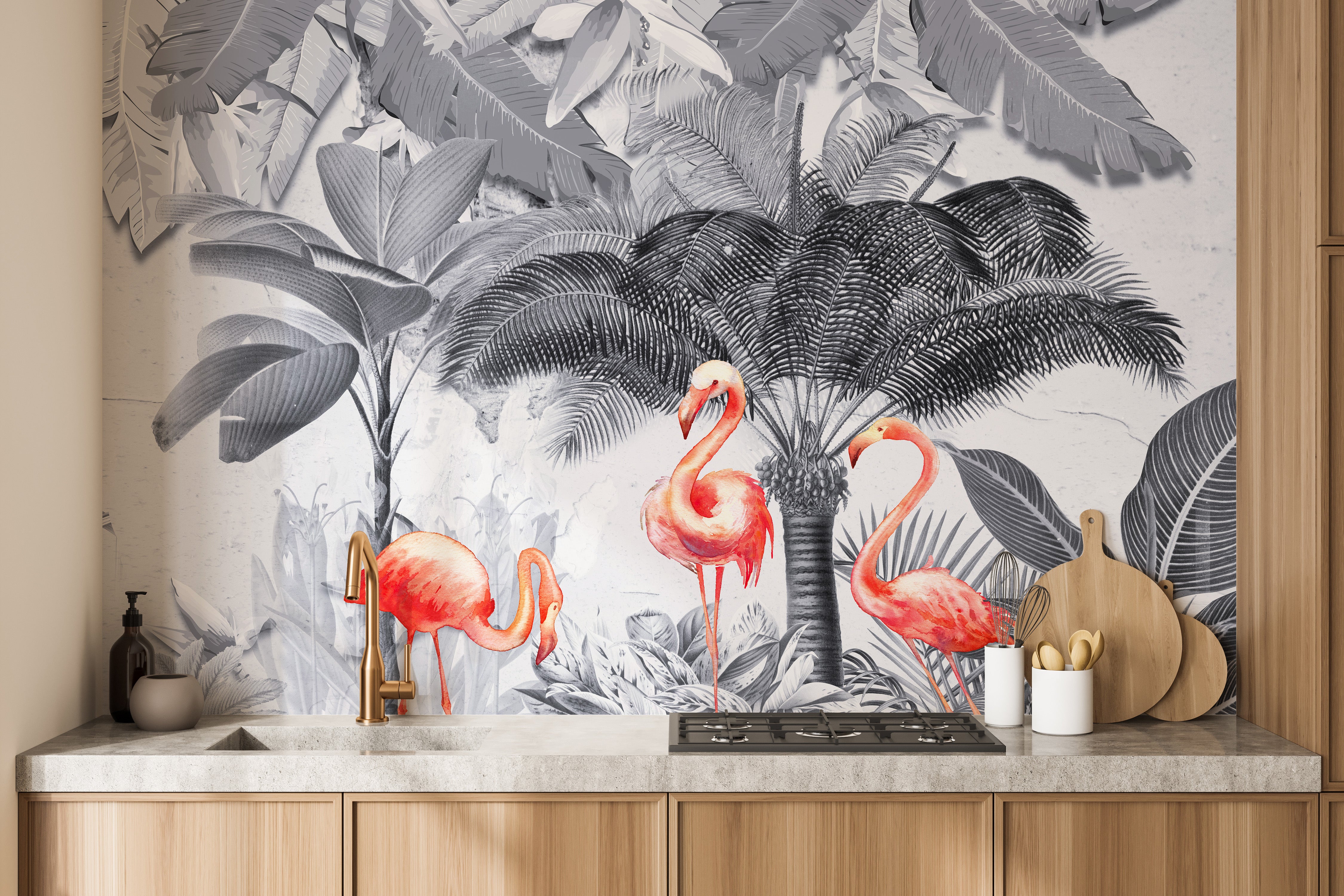 Step into a whimsical monochrome forest accented with striking pink flamingos with our mural wallpaper. This unique design combines the serene beauty of a monochrome forest with the vibrant touch of pink flamingos, creating a captivating contrast that brings life and color to any room. Ideal for homeowners and interior designers looking to add a playful yet elegant touch to spaces such as bedrooms, bathrooms, or lounges, this mural provides a stunning visual escape that's both tranquil and spirited.