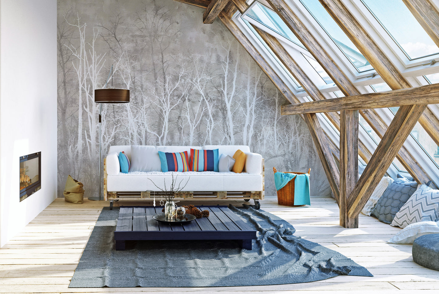Modern woodland wallpaper mural in grayscale design