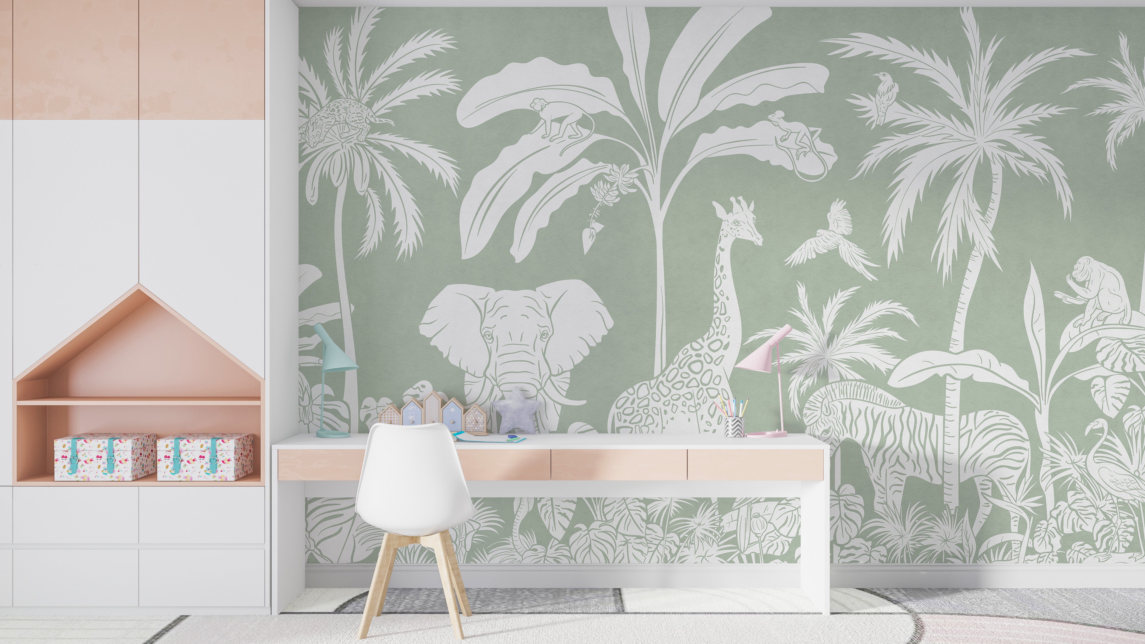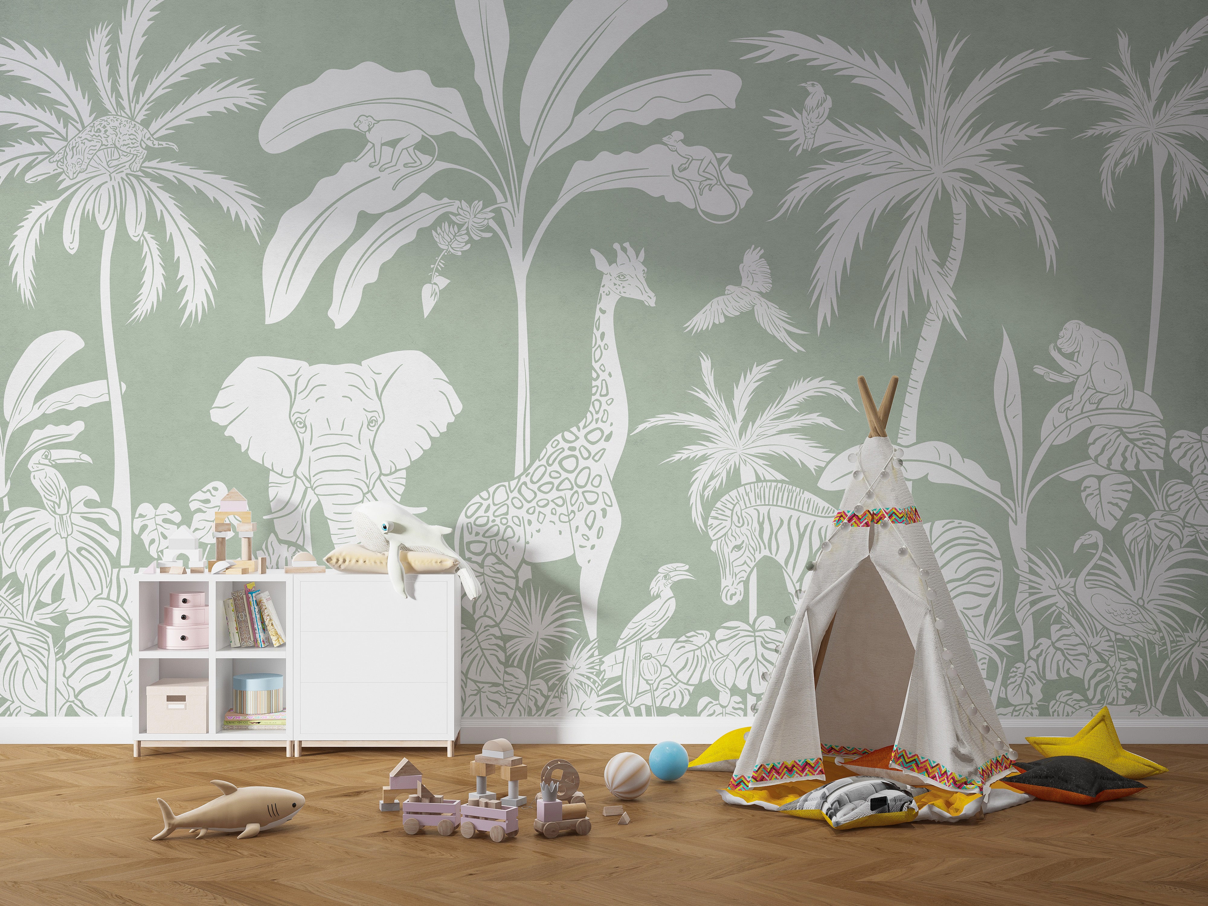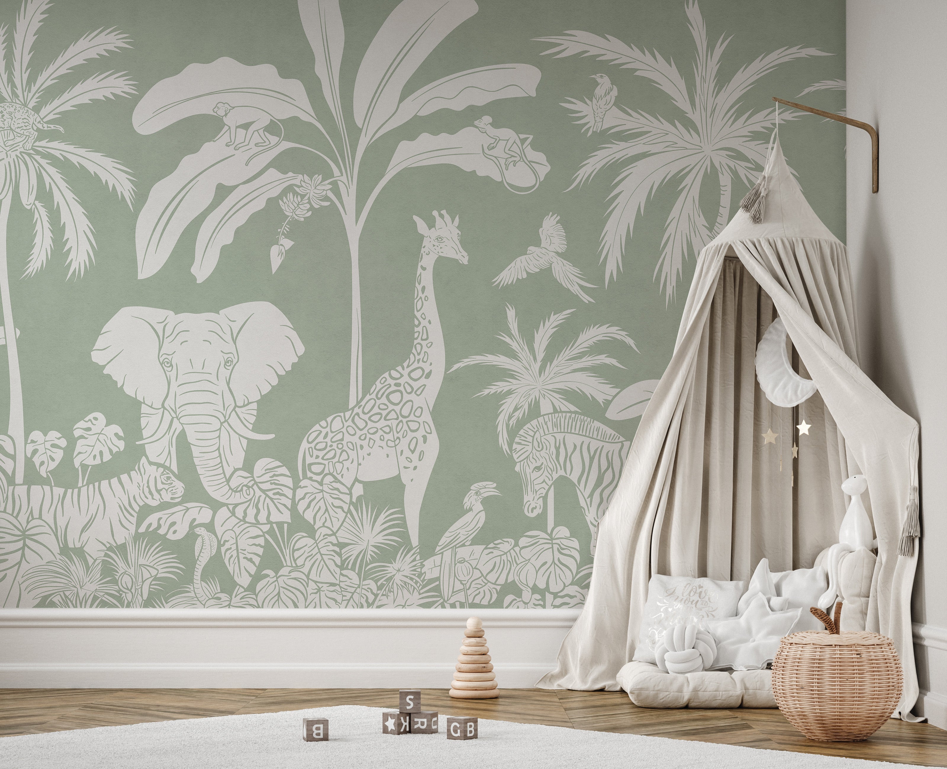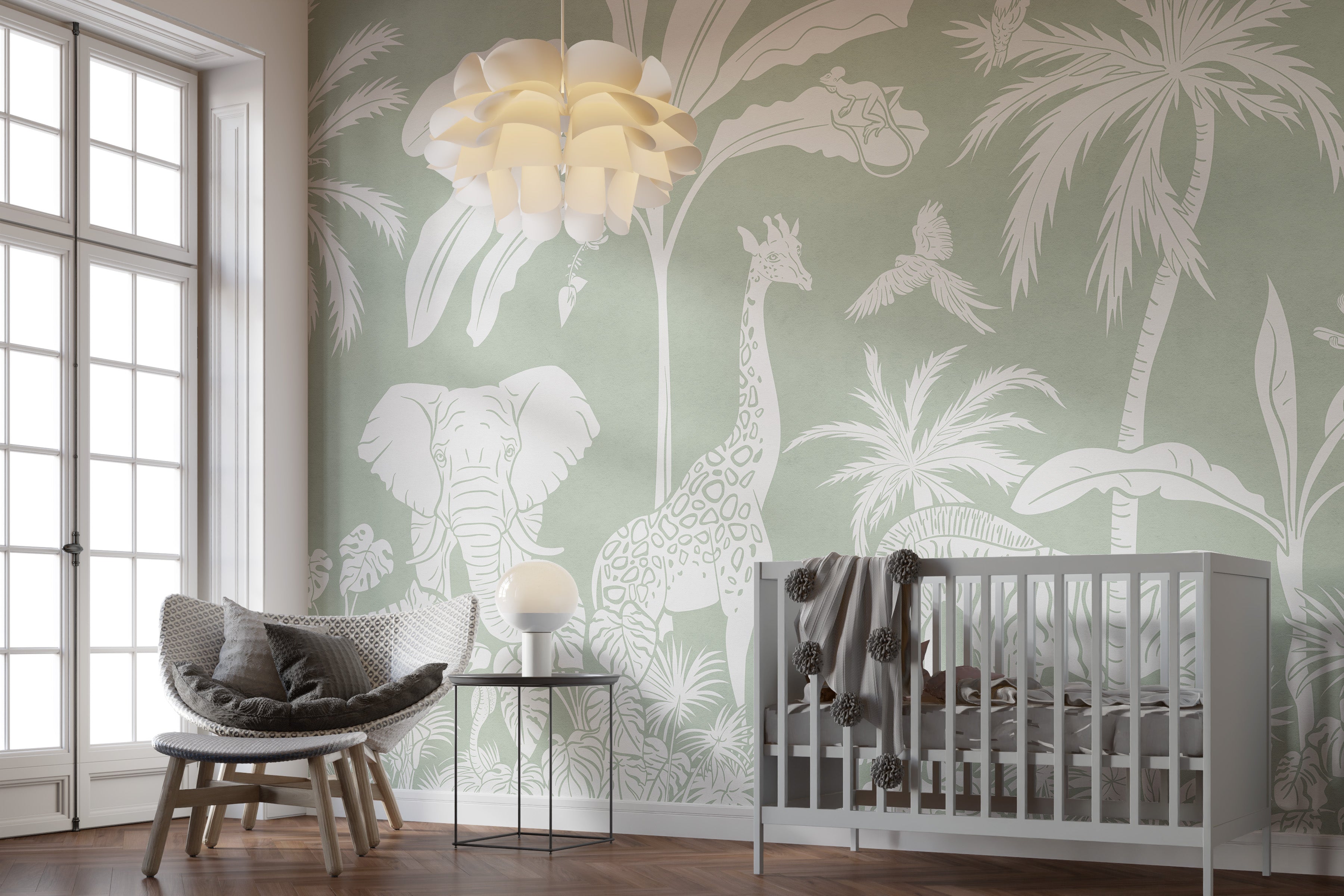 Enhance your nursery’s look with the monochrome jungle green wall mural. Its sophisticated design combines green hues, creating a serene environment for your little one. The intricate jungle patterns capture attention, making a unique statement in any nursery. This mural not only brings nature into your baby's room but also provides a calming backdrop for restful sleep and playful activities. Choose this mural to give your nursery a chic and stylish feel that both you and your baby will love. Limited Time Offer: Transform your space with our stunning wallpaper!