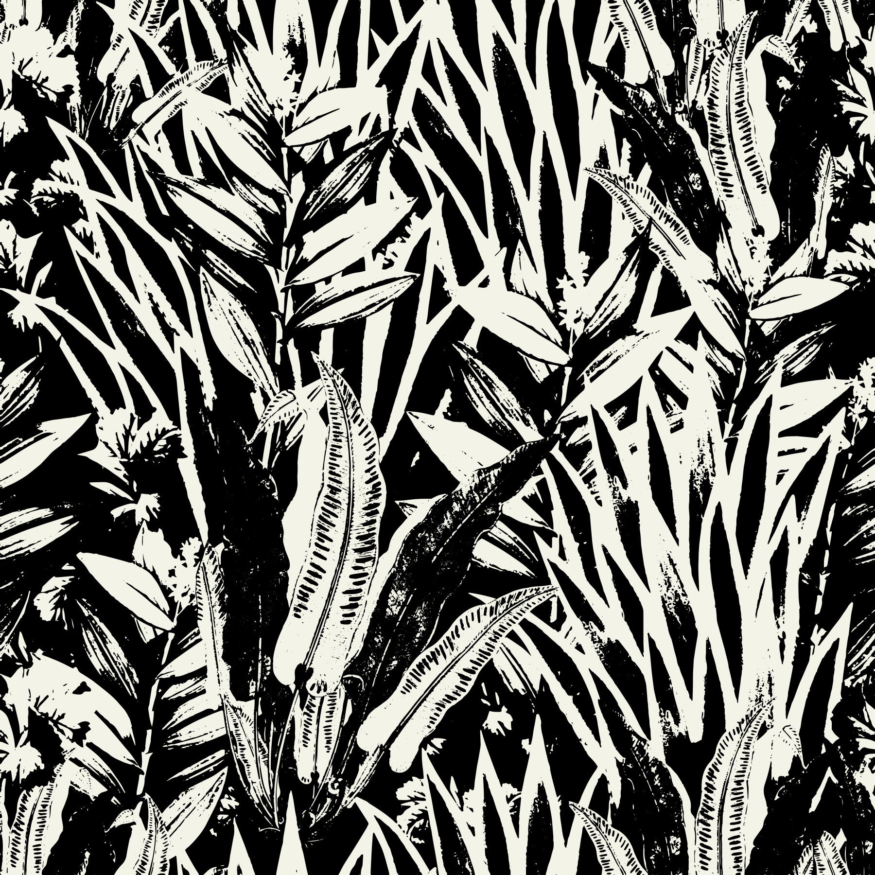Transform your space with this striking monochrome jungle pattern. The bold, graphic design features various leaves and foliage in black and off-white, creating a dramatic contrast. This wallpaper for walls provides a modern twist on tropical themes. Imagine it making a splash in a living room or adding intrigue to a hallway. The strong contrasts and detailed leaf patterns complement minimalist interiors and boost visual interest.