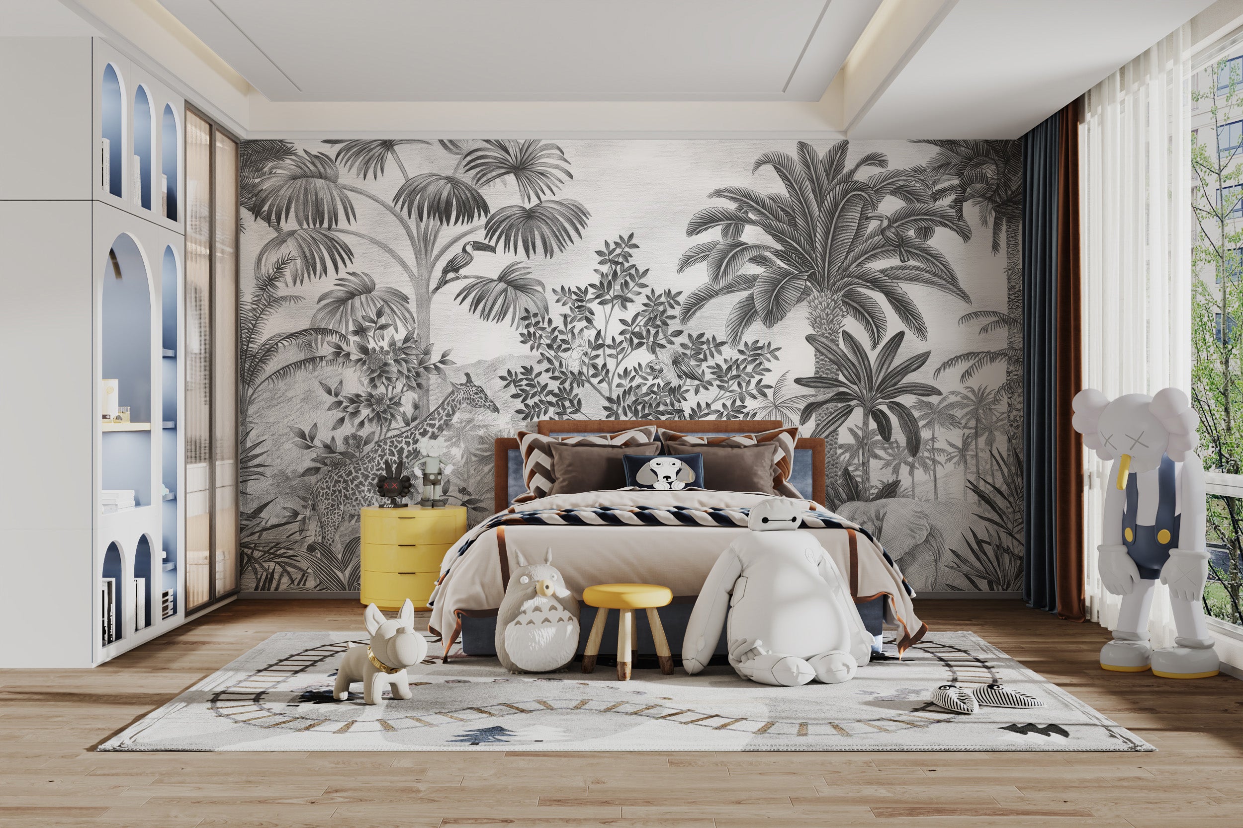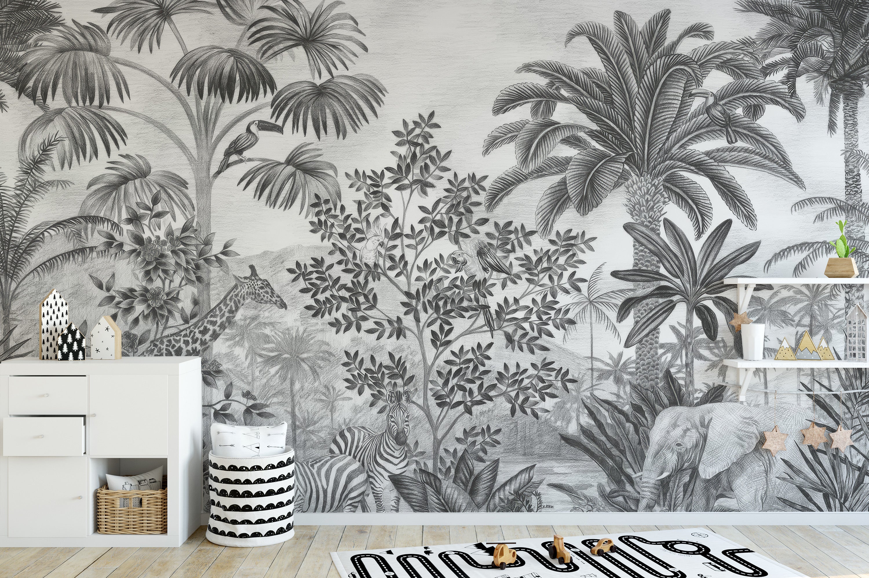 This monochrome tropical jungle wallpaper offers a unique look for any room. This wallpaper features detailed illustrations of giraffes, zebras, and lush vegetation. Its monochrome design creates a bold yet elegant statement, perfect for any setting. The intricate details of the jungle scene bring life and adventure to your home. This jungle wallpaper is perfect for those who love nature and want a stylish, unique design on their walls. Order your monochrome tropical jungle wallpaper today and bring an exotic touch to your space. Enhance your living space with a touch of the wild, and make every room a conversation starter.