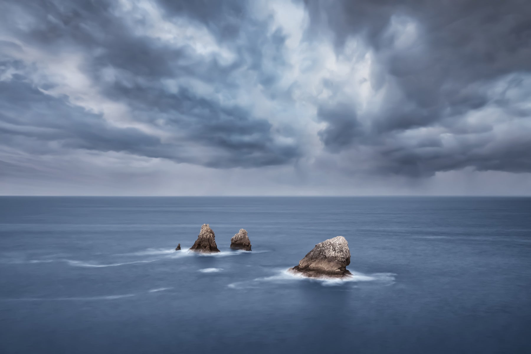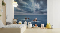 Elevate your space with this evocative image of a stormy ocean and rocky outcrops beneath a turbulent sky. This wallpaper for walls is an amazing choice. The muted blues and grays create a soothing atmosphere, making it perfect for a bedroom, study, or meditation space. The interplay of light and shadow in the clouds adds depth and visual interest. The overall scene harmonizes with modern decor and brings a sophisticated touch. A sense of calm and powerful beauty of the natural world into interiors.