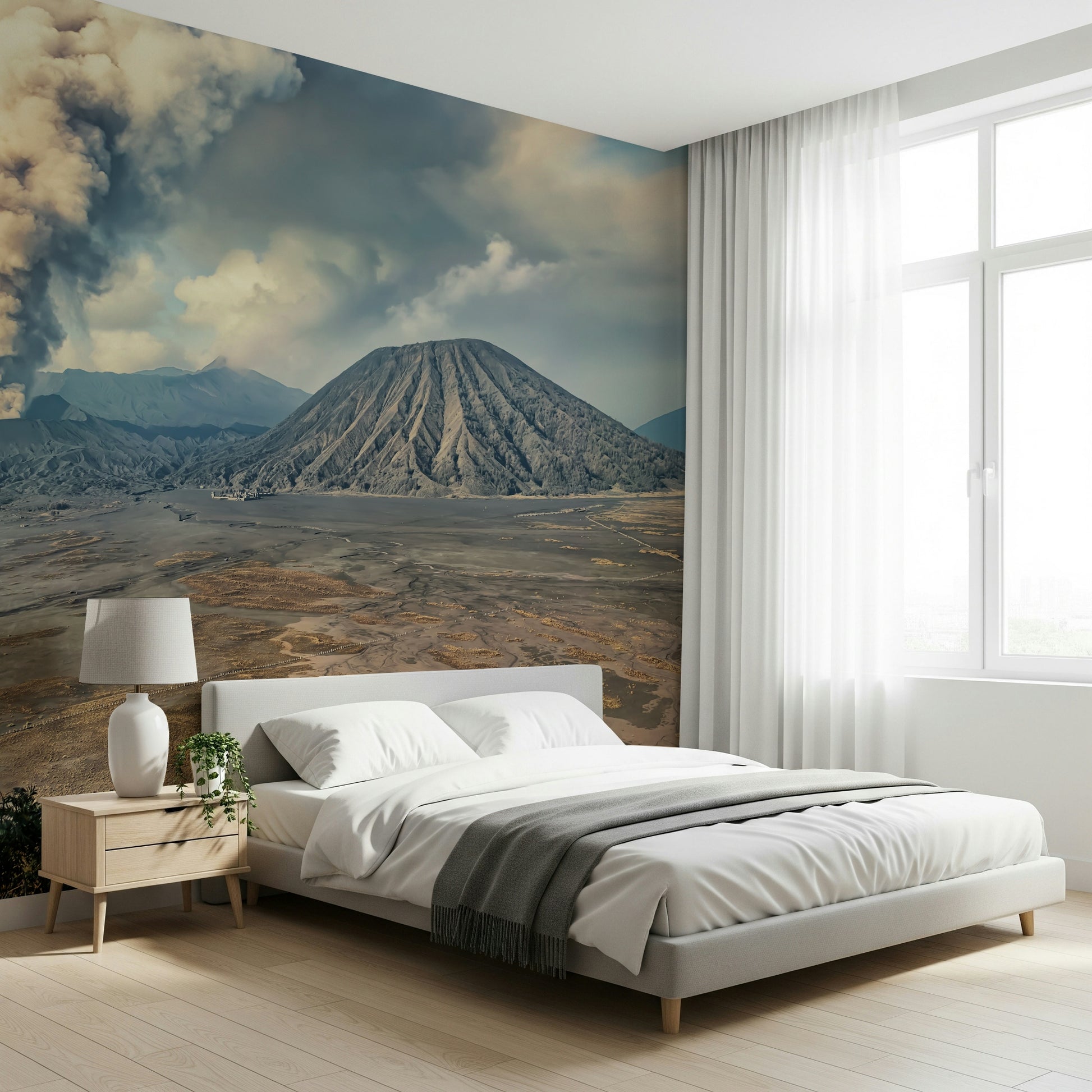 Witness the majesty of Mount Bromo with this arresting wallpaper. The scene presents a stark landscape, dominated by the volcano's plume against a bright sky. Hues of brown and gray mix together, creating a stunning effect. Install this wallpaper for walls and let its unique design transform your space into a statement. This landscape works exceptionally well in living rooms, offices, or even hallways, bringing a natural, calming effect and pairing nicely with modern and minimalist designs.