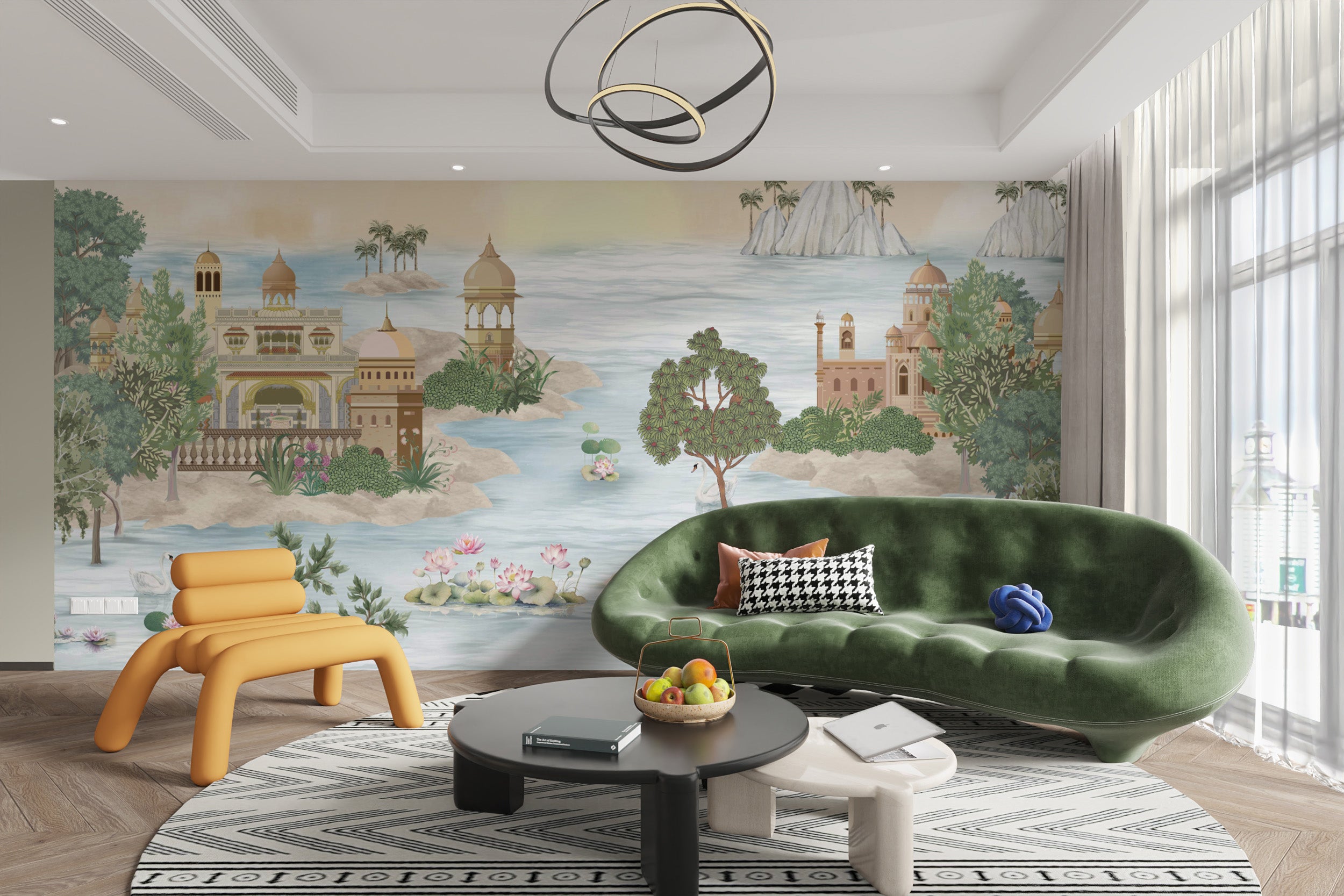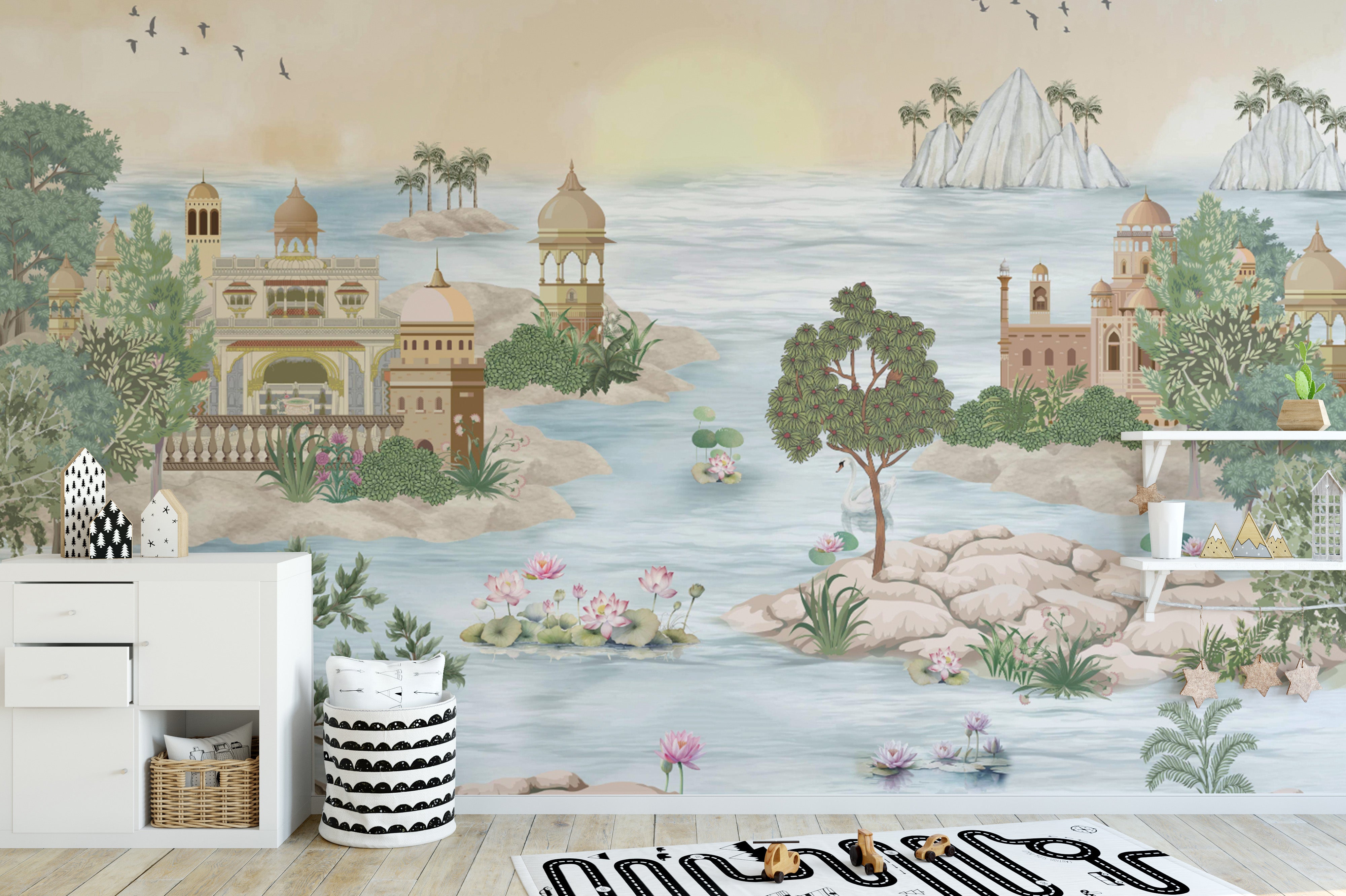 Grand palaces stand gracefully by a serene lake wallpaper mural, reflecting their intricate details in the calm waters. Lush gardens bloom with vibrant lotus flowers, creating a water garden wallpaper that captures nature's beauty. Birds glide across the sky, enhancing the elegance of this royal palace wallpaper. The delicate architecture of domes and archways showcases a traditional Indian palace mural, bringing historical charm to the interiors. Towering palm trees and rolling hills add depth to the scenic landscape mural. This Mughal architecture wallpaper highlights timeless beauty, offering a glimpse into the grandeur of ancient craftsmanship and regal serenity.