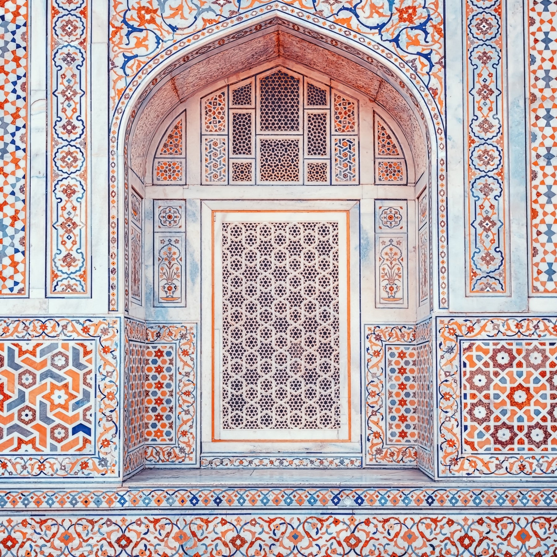 Immerse yourself in the splendor of Mughal architecture with this stunning wallpaper. The rich tapestry of colors—vibrant oranges, deep blues, and soft creams—creates a mesmerizing visual feast. Intricate floral and geometric designs meticulously crafted in marble form a captivating pattern that speaks volumes about the artistry and grandeur of the Mughal era. This wallpaper transcends a simple decorative element, becoming a statement piece that evokes a sense of awe and wonder. Its detailed textures and regal ambiance create an opulent feel, perfectly suited for homes and spaces yearning for a touch of exquisite history.