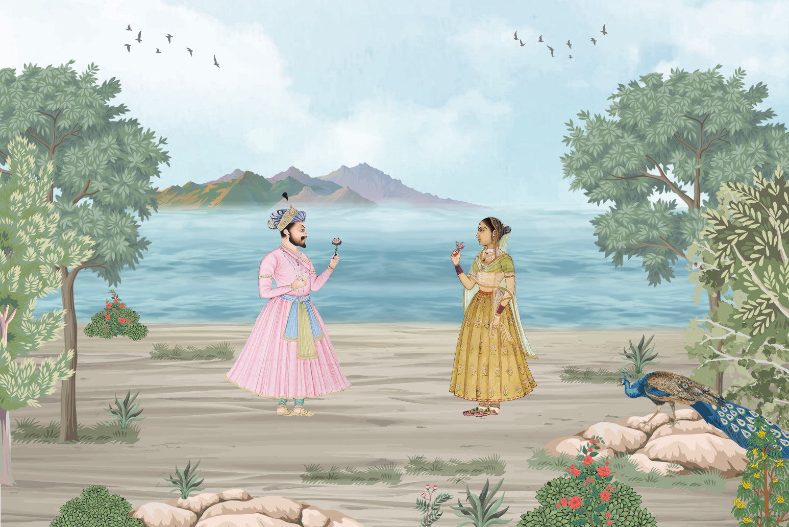 This mughal royal couple wall mural reflects the elegance of traditional mughal miniature art, featuring a regal pair exchanging flowers by a serene lake. The intricate details of royal attire, delicate flora, and a majestic peacock create a heritage-inspired setting. The scenic background with lush trees and distant mountains enhances the romantic and historical theme. Inspired by classic Persian art, this luxury palace-theme wallpaper blends well with traditional and contemporary interiors. The fine craftsmanship and rich color palette highlight the beauty of Mughal royalty, making it an excellent choice for spaces seeking a timeless heritage appeal.